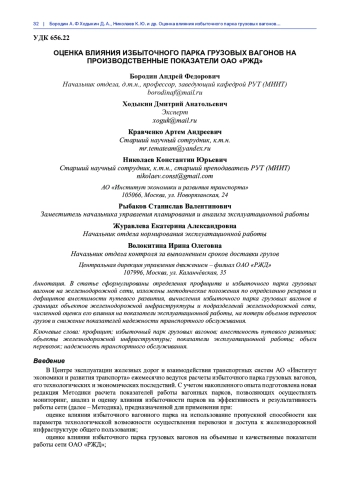 В Центре эксплуатации железных дорог и взаимодействия транспортных систем АО «Институт экономики и развития транспорта» ежемесячно ведутся расчеты избыточного парка грузовых вагонов, его технологических и экономических последствий. С учетом накопленного опыта подготовлена новая редакция Методики расчета показателей работы вагонных парков, позволяющих осуществлять мониторинг, анализ и оценку влияния избыточности парков на эффективность и результативность работы сети (далее – Методика), предназначенной для применения при: