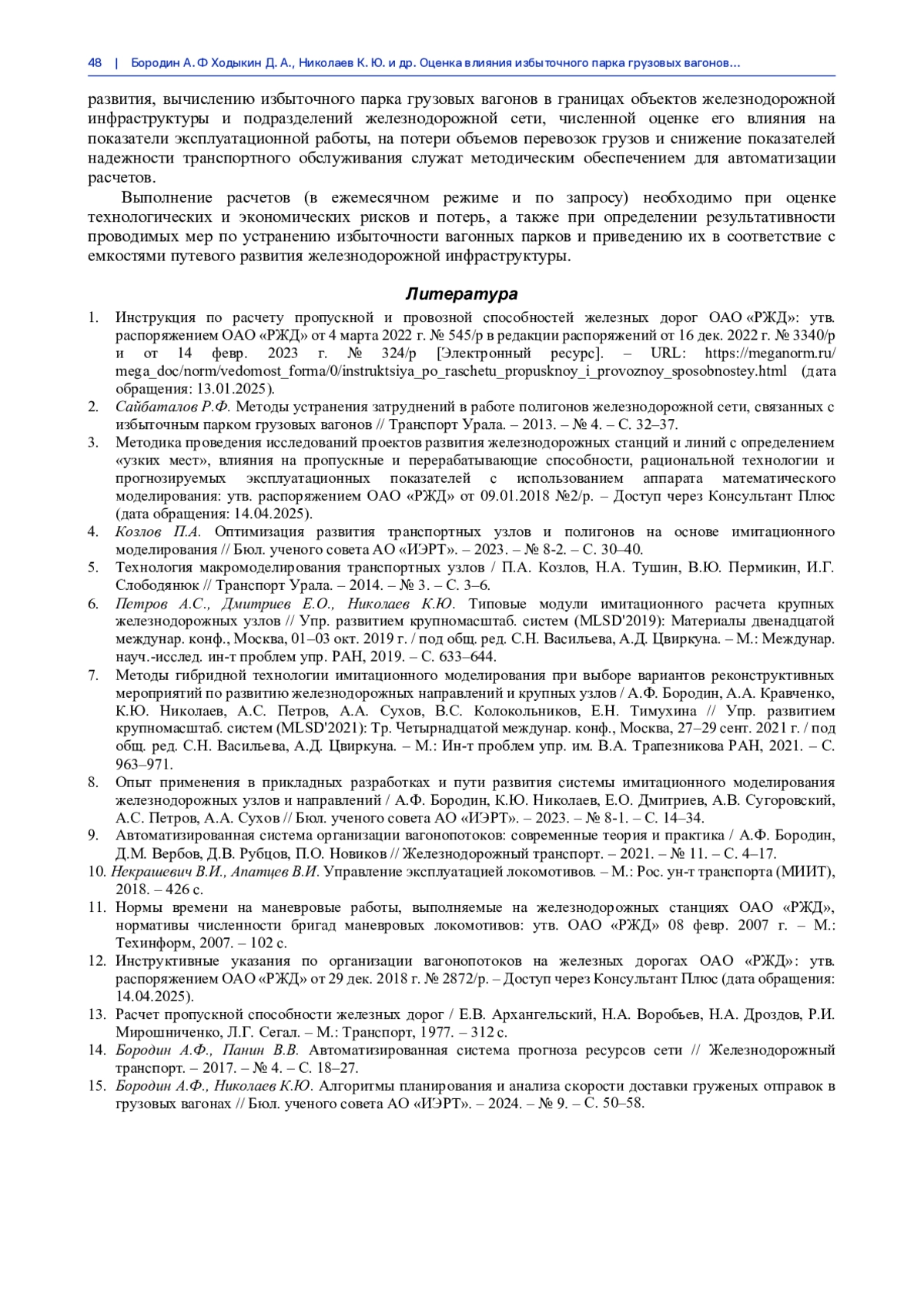 1. Инструкция по расчету пропускной и провозной способностей железных дорог ОАО “РЖД”: утв. распоряжением ОАО “РЖД” от 4 марта 2022 г. № 545/р в редакции распоряжений от 16 дек. 2022 г. № 3340/р и от 14 февр. 2023 г. № 324/р [Электронный ресурс]. - URL: https://meganorm.ru/mega_doc/norm/vedomost_forma/0/instruktsiya_po_raschetu_propusknoy_i_provoznoy_sposobnostey.html (дата обращения: 13.01.2025).