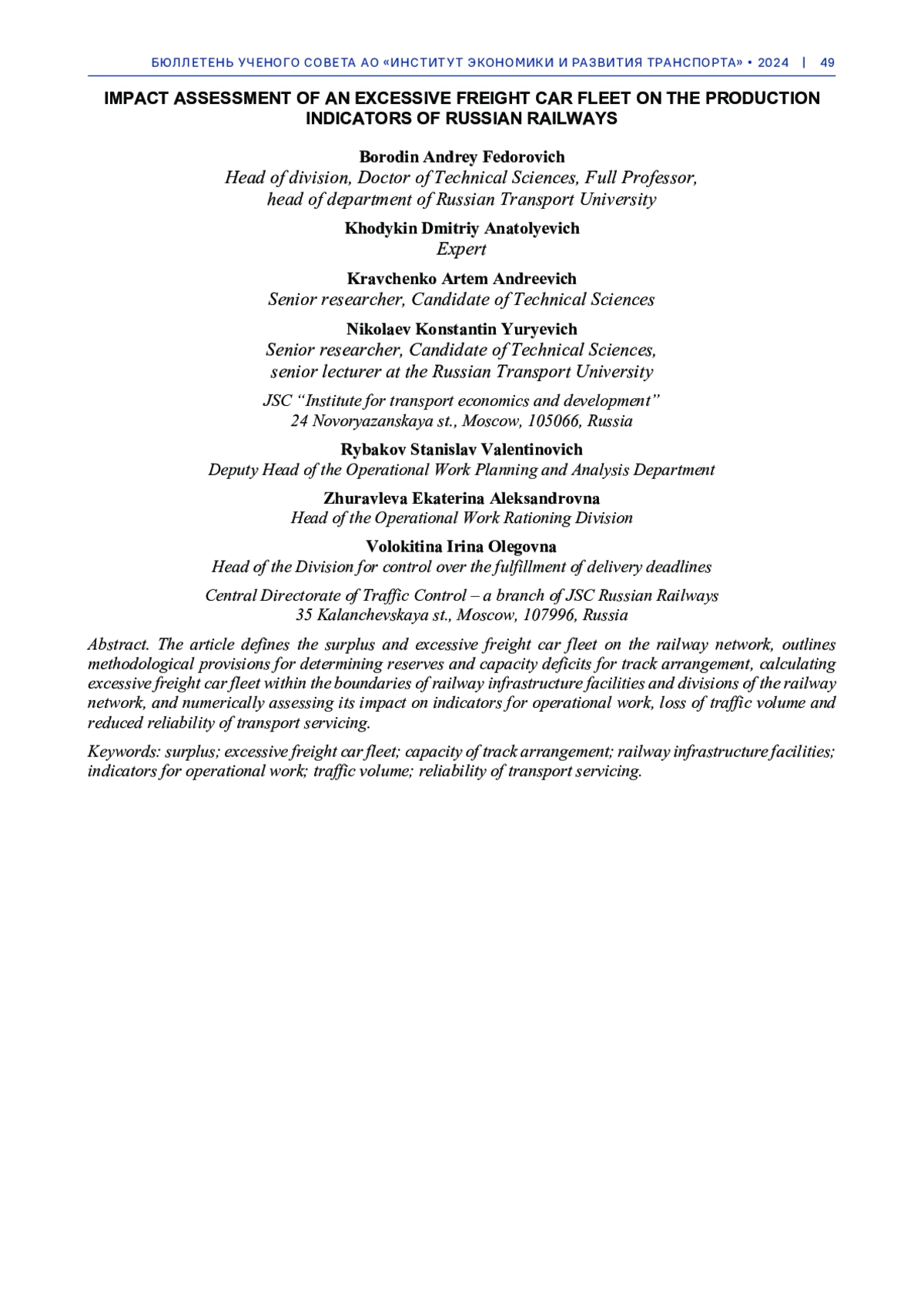 15. Бородин А.Ф., Николаев К.Ю. Алгоритмы планирования и анализа скорости доставки груженых отправок в грузовых вагонах // Бюл. ученого совета АО “ИЭРТ”. - 2024. - № 9. - С. 50-58.