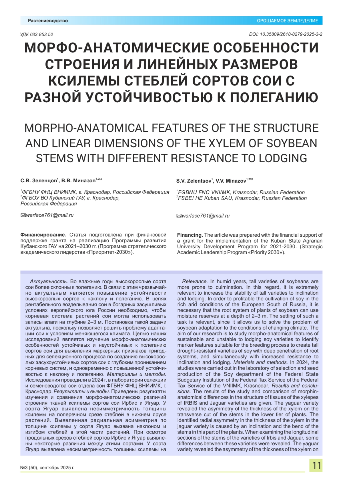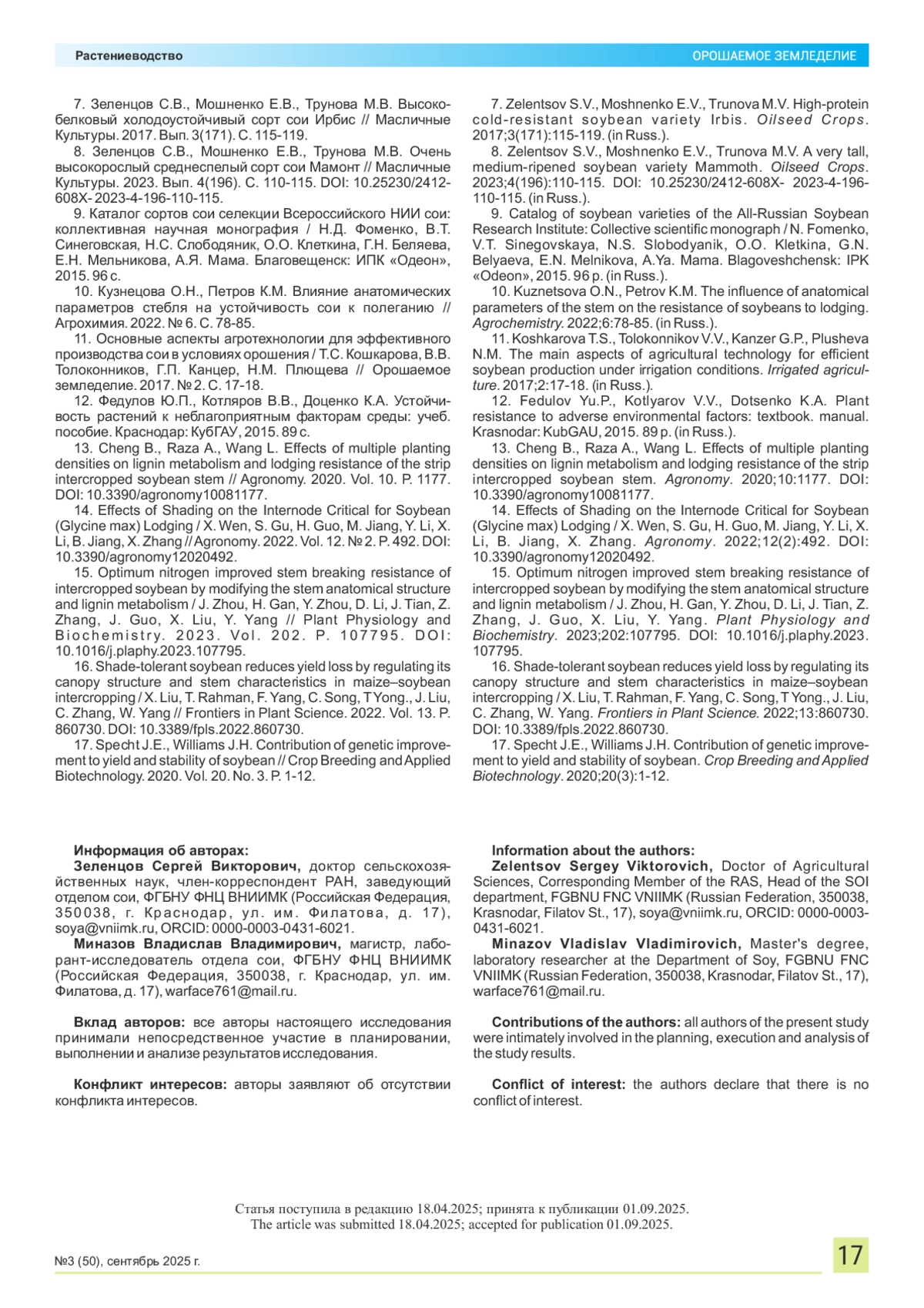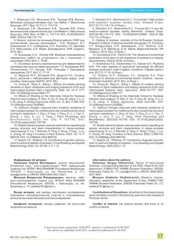 10. Кузнецова О.Н., Петров К.М. Влияние анатомических параметров стебля на устойчивость сои к полеганию // Агрохимия. 2022. № 6. С. 78-85.