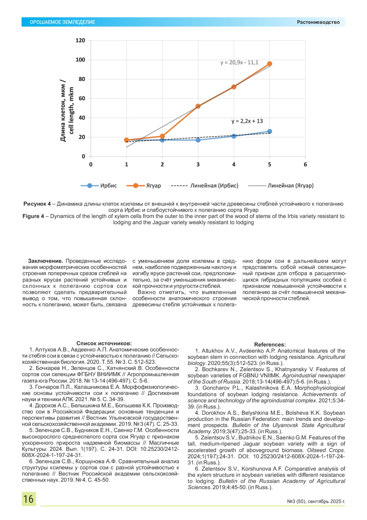 6. Зеленцов С.В., Коршунова А.Ф. Сравнительный анализ структуры ксилемы у сортов сои с разной устойчивостью к полеганию // Вестник Российской академии сельскохозяйственных наук. 2019. № 4. С. 45-50. References.