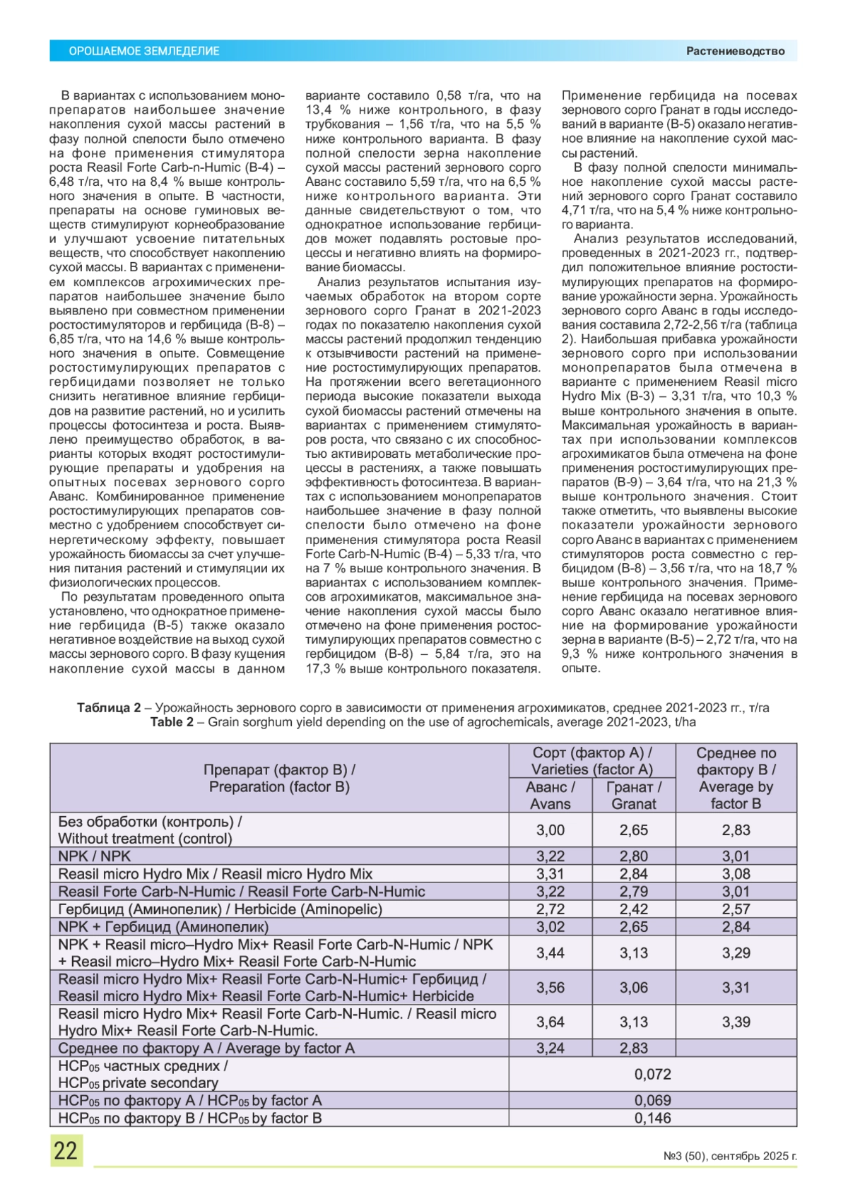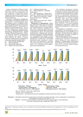 Применение современных агрохимикатов (пестициды, гербициды, удобрения и другие агрохимические препараты), направленное на получение высоких урожаев сельскохозяйственных культур и защиту культур, в настоящее время является чрезвычайно важным вопросом в агрономии. В задачи исследований входила оценка влияния различных агрохимикатов на рост и развитие зернового сорго, урожайность и качество зерна зернового сорго. Материалы и методы. Исследования проводились в Гагаринском районе Саратовской области на черноземе южном в 2021-2023 гг. Почва представлена черноземом южным маломощным, среднесуглинистым, типичным для сухих черноземных степей Юго-Востока России. Результаты и выводы. Было установлено положительное влияние ростостимулирующих препаратов и удобрений на морфометрические показатели зернового сорго по сравнению с контрольным вариантом. Обработка агрохимикатами способствовала ускорению ростовых процессов и увеличению вегетационной массы. Максимальные показатели увеличения урожайности биомассы и зерна были выявлены на вариантах с внесением ростостимулирующих препаратов. Установлено, что раздельное и совместное применение минеральных удобрений, ростовых препаратов и гербицида Аминопелик существенно повлияли на продуктивность зернового сорго. В среднем в 2021-2023 гг. высокая урожайность зерна была достигнута благодаря применению комплекса агрохимических препаратов в период вегетации растений. Разовое применение агрохимикатов способствовало увеличение урожайности зерна сорго на 7-10 %, комплексное применение увеличило урожайность зерна на 16-18 % по сравнению с контрольным вариантом. В целом, результаты исследований подчеркивают важность применения комплексных агрохимических препаратов для повышения урожайности зернового сорго в условиях Саратовской области на черноземе южном.