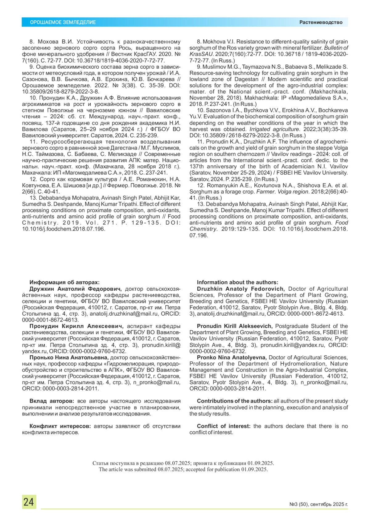 10. Пронудин К.А., Дружкин А.Ф. Влияние использования агрохимикатов на рост и урожайность зернового сорго в степном Поволжье на черноземе южном // Вавиловские чтения - 2024: сб. ст. Международ. науч.-практ. конф., посвящ. 137-й годовщине со дня рождения академика Н.И. Вавилова (Саратов, 25-29 ноября 2024 г.) / ФГБОУ ВО Вавиловский университет. Саратов, 2024. С. 235-239.