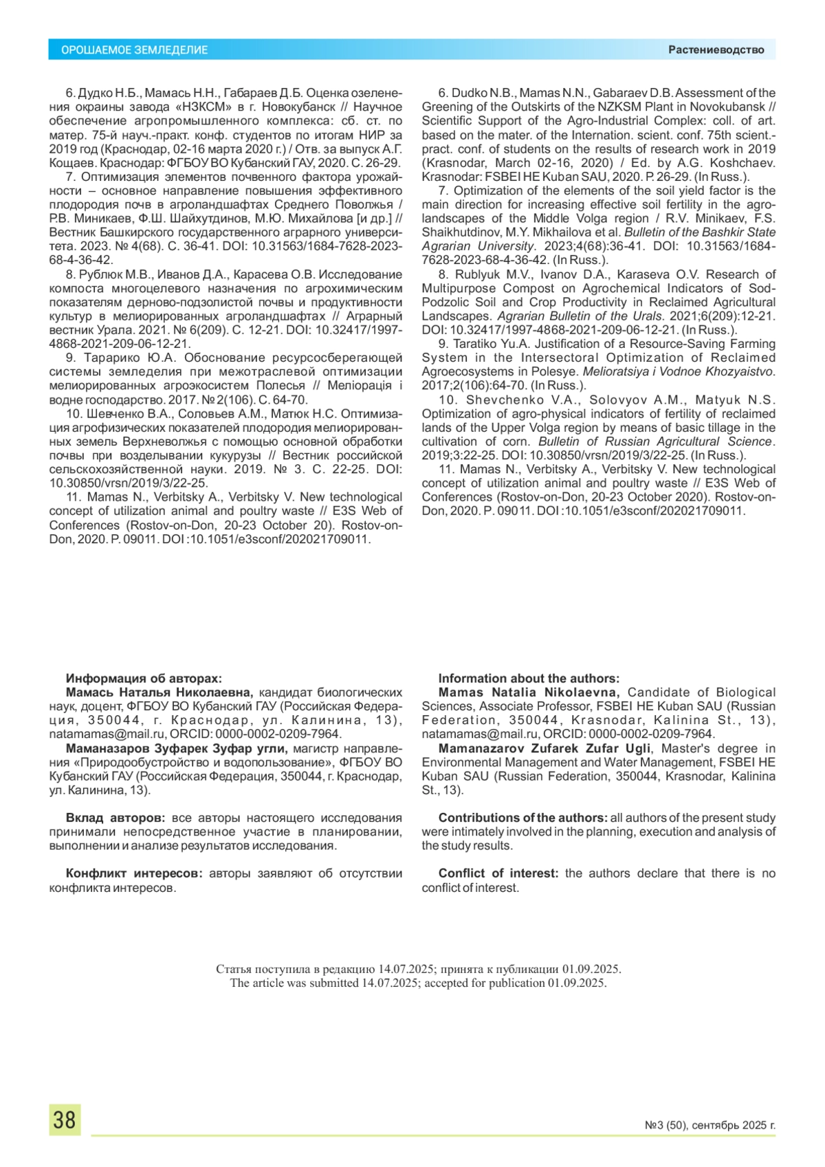 6. Дудко Н.Б., Мамась Н.Н., Габараев Д.Б. Оценка озеленения окраины завода “НЗКСМ” в г. Новокубанск // Научное обеспечение агропромышленного комплекса: сб. ст. по матер. 75-й науч.-практ. конф. студентов по итогам НИР за 2019 год (Краснодар, 02-16 марта 2020 г.) / Отв. за выпуск А.Г. Кощаев. Краснодар: ФГБОУ вО Кубанский ГАУ, 2020. С. 26-29.