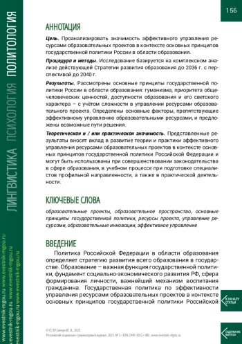 Цель. Проанализировать значимость эффективного управления ресурсами образовательных проектов в контексте основных принципов государственной политики России в области образования.