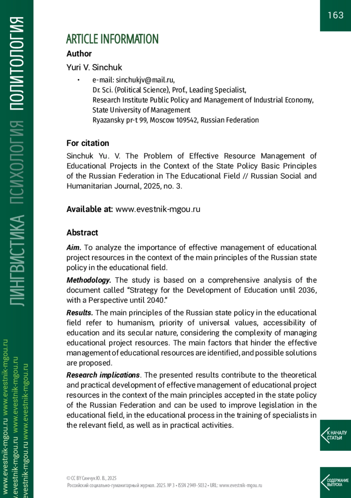 Теоретическая и / или практическая значимость. Представленные результаты вносят вклад в развитие теории и практики эффективного управления ресурсами образовательных проектов в контексте основных принципов государственной политики Российской Федерации и могут быть использованы при совершенствовании законодательства в сфере образования, в учебном процессе при подготовке специалистов профильной направленности, а также в практической деятельности.