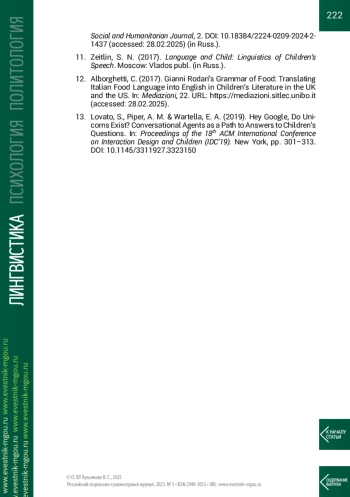 12. Alborghetti C. Gianni Rodari’s grammar of food: Translating Italian food language into English in children’s literature in the UK and the US [Электронный ресурс] // Mediazioni. 2017. №22. URL: https://mediazioni.sitlec.unibo.it (дата обращения: 28.02.2025).