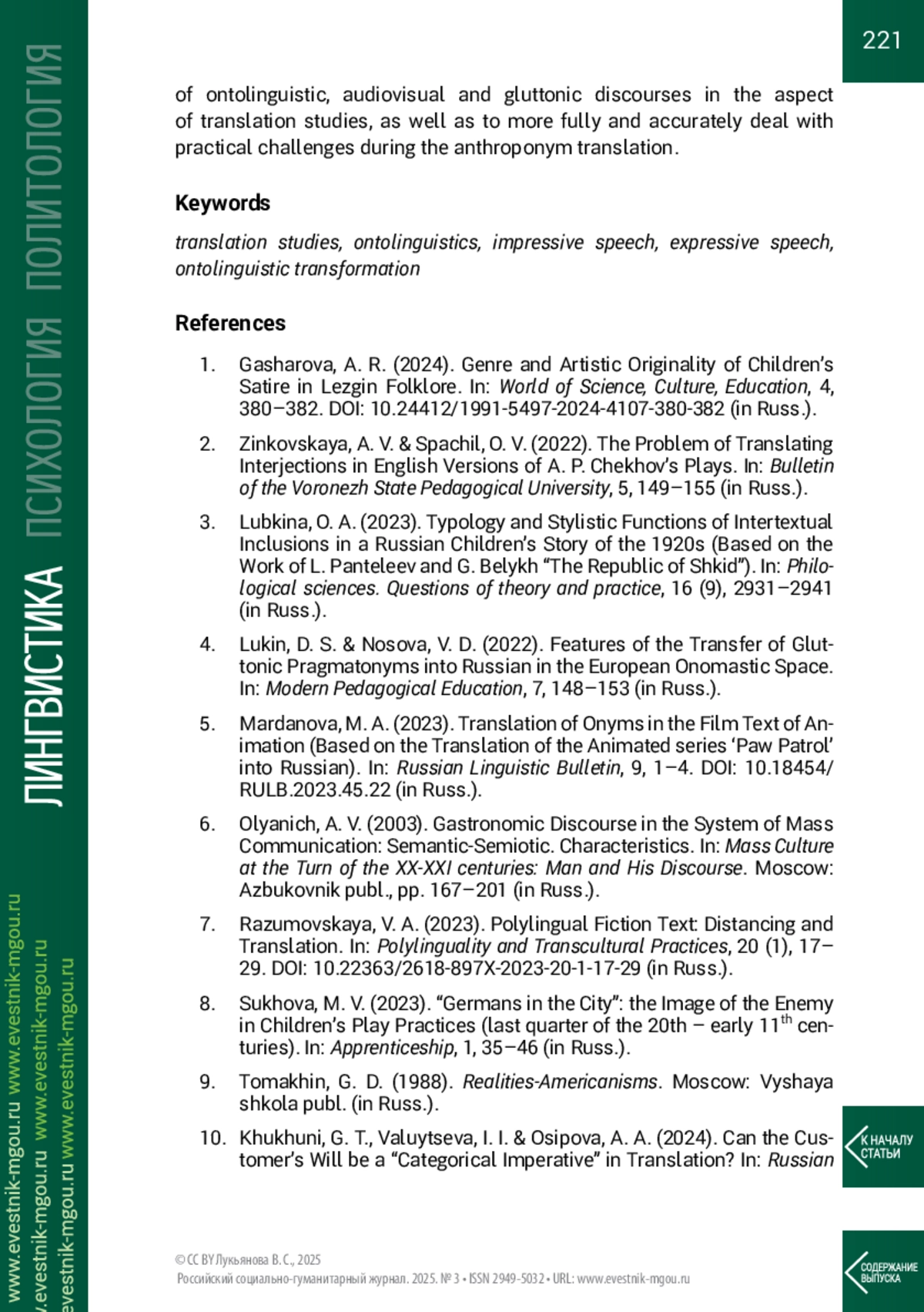 7. Разумовская В. А. Полинингвальный художественный текст: отстранение и перевод // Полилингвальность и транскультурные практики. 2023. Т. 20. №1. С. 17-29. https://doi.org/10.22363/2618-897X-2023-20-1-17-29