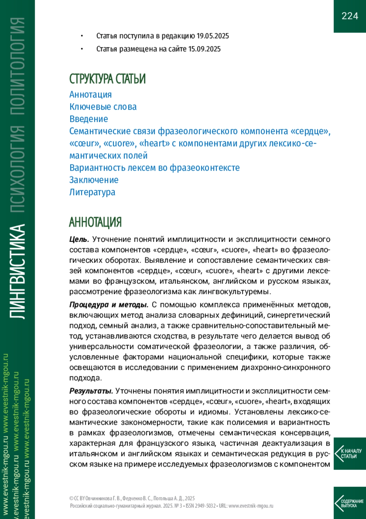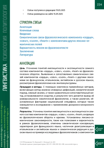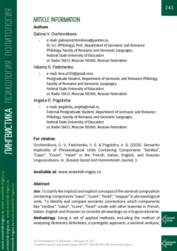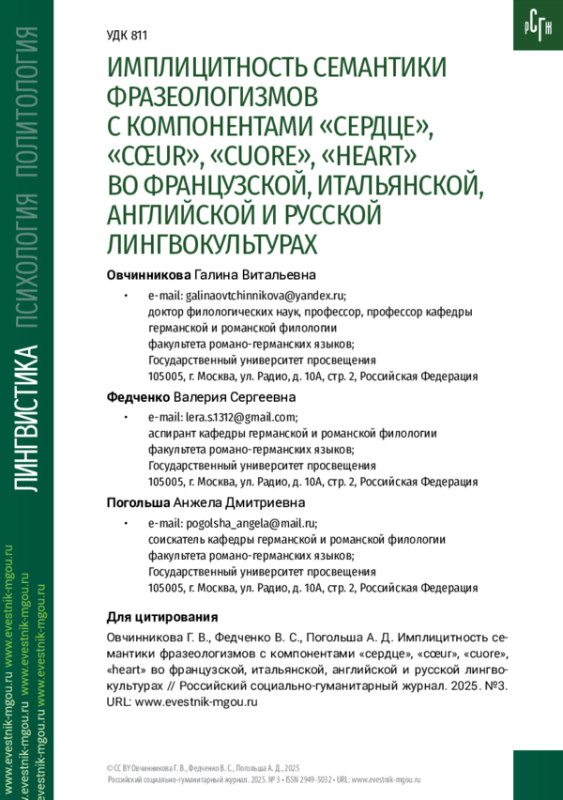 11. Ломакина О. В., Овчинникова Г. В. Фразеообразующий потенциал соматизма сердце / cœur / Herz в русском, французском и немецком языках // Вестник Балтийского федерального университета им. И. Канта. Серия: Филология, педагогика, психология. 2021. №1. С.19-28.
