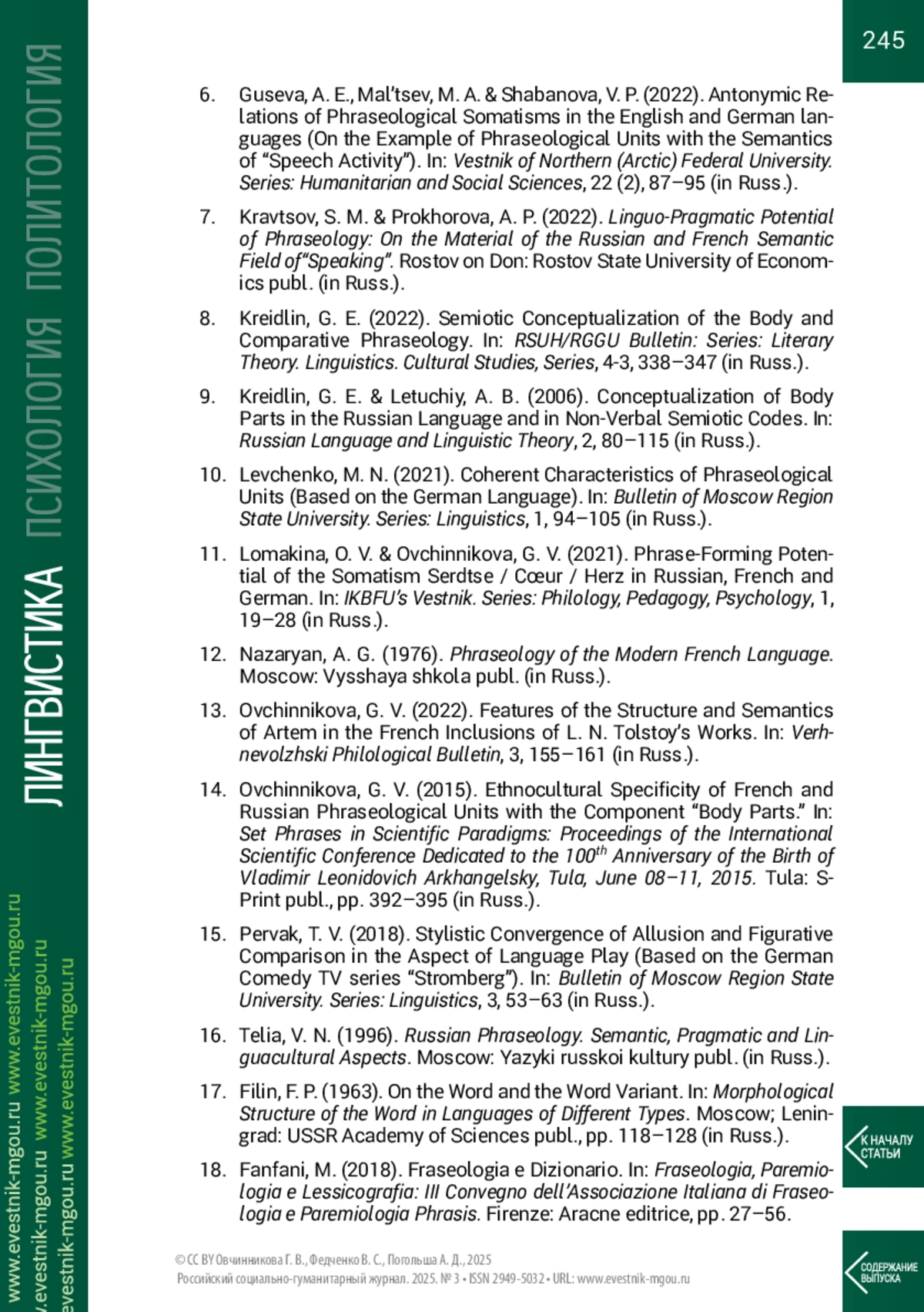 8. Крейдлин Г. Е. Семиотическая концептуализация тела и сравнительная фразеология // Вестник Российского государственного гуманитарного университета. Серия: Литературоведение. Языкознание. Культурология. 2022. №4-3. C. 338-347.