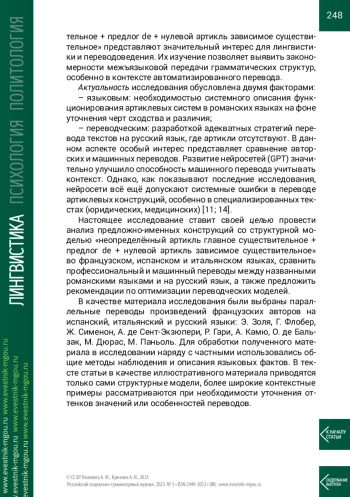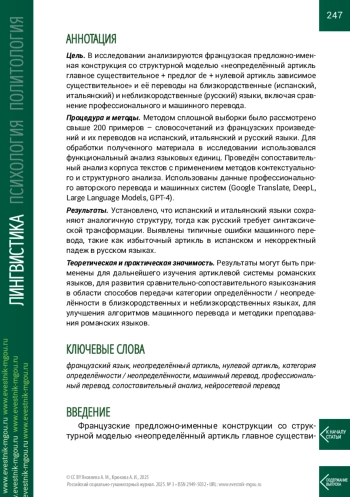 Результаты. Установлено, что испанский и итальянский языки сохраняют аналогичную структуру, тогда как русский требует синтаксической трансформации. Выявлены типичные ошибки машинного перевода, такие как избыточный артикль в испанском и некорректный падеж в русском языках.