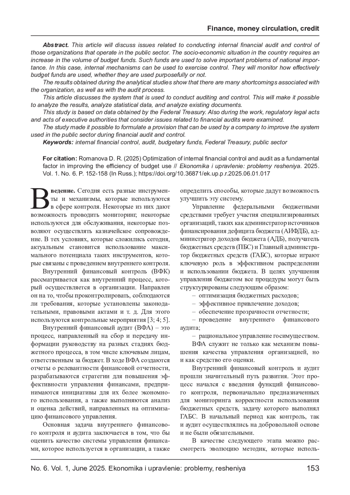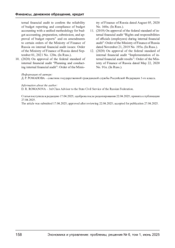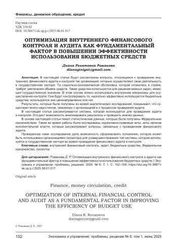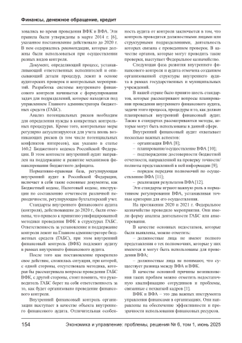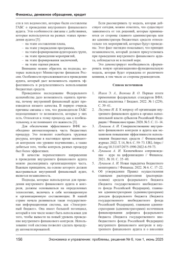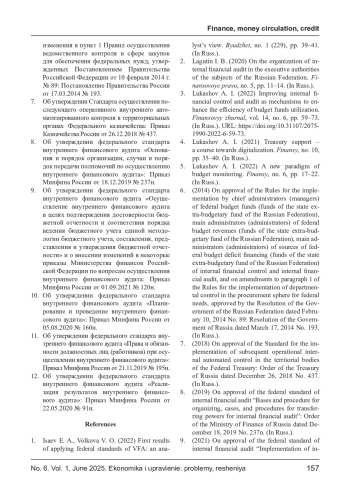 3. Лукашов А. И. Совершенствование внутреннего финансового контроля и аудита как механизмов повышения эффективности использования бюджетных средств // Финансовый журнал. 2022. Т. 14, № 6. С. 59-73. URL:. DOI: 10.31107/2075-1990-2022-6-59-73 EDN: WZUVIL