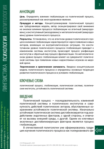 Результаты. Установлено, что на агентном уровне политического процесса влияние глобализации характеризуется через появление новых акторов, влияющих на внутриполитическую ситуацию. На конститутивном уровне политического процесса глобализация приводит к изменениям системы институтов, происходят процесс унификации институтов и обратный ему процесс фрагментации. На метаполитическом уровне процесс глобализации влияет на суверенитет политической системы при появлении новых надсистемных игроков на мировой арене.