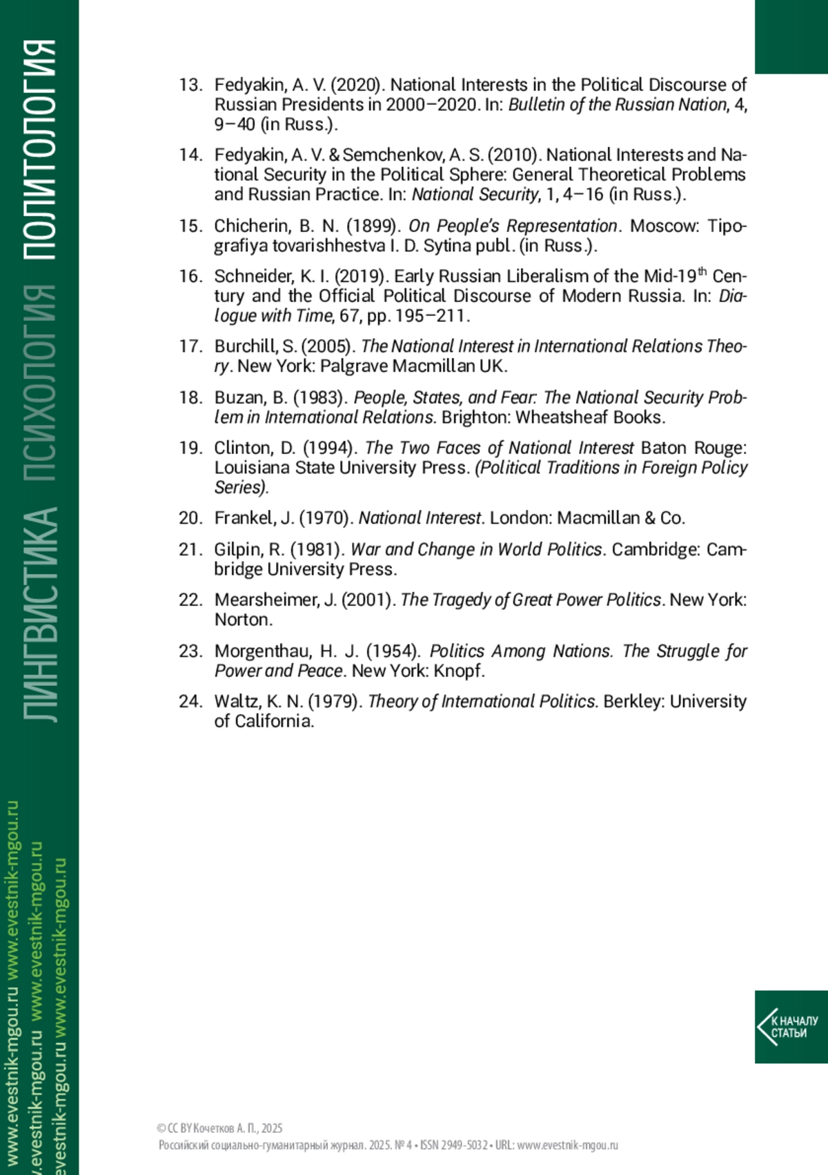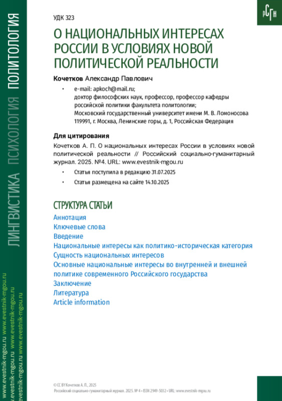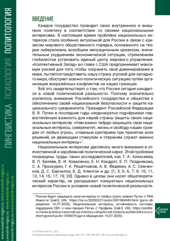 Процедура и методы. В статье анализируются теоретические аспекты и основное содержание национальных интересов России в новых политических условиях. Применяются историко-политологический метод, сравнительный метод, метод анализа и синтеза, метод многостороннего подхода.