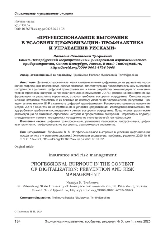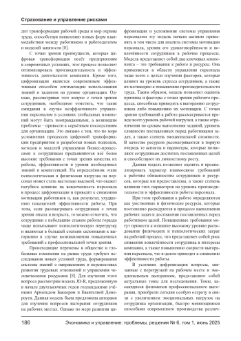 Целью исследования является изучение влияния цифровизации на управление персоналом современных предприятий, анализ факторов, способствующих профессиональному выгоранию сотрудников в условиях цифровой трансформации, а также разработка рекомендаций по снижению уровня стрессовой нагрузки на персонал с применением модели JD-R. Проведен анализ влияния цифровизации на управление персоналом, включая проблемы выгорания сотрудников. Описаны современные цифровые технологии и их влияние на систему управления человеческими ресурсами. Проведен анализ модели JD-R в контексте цифровой трансформации. Рассмотрены основные положения модели JD-R с акцентом на её применение в условиях цифровизации. Исследована взаимосвязь между рабочими требованиями, ресурсами и риском выгорания сотрудников. Предложены практические рекомендации по снижению стрессовой нагрузки и профилактике выгорания. Разработаны подходы к поддержанию ментального здоровья сотрудников на этапе цифровой трансформации.