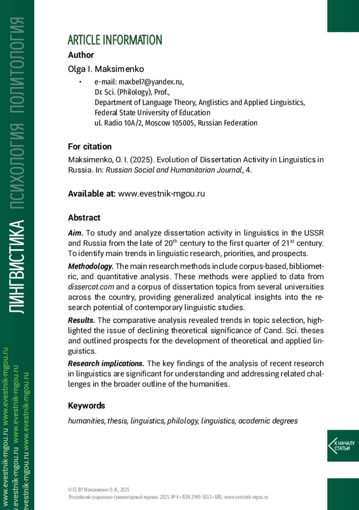 Цель. Изучение и анализ диссертационной активности в сфере языкознания в СССР и России конца XX – первой четверти XXI вв. Выявление основных тенденций лингвистических исследований, приоритетов и перспектив.