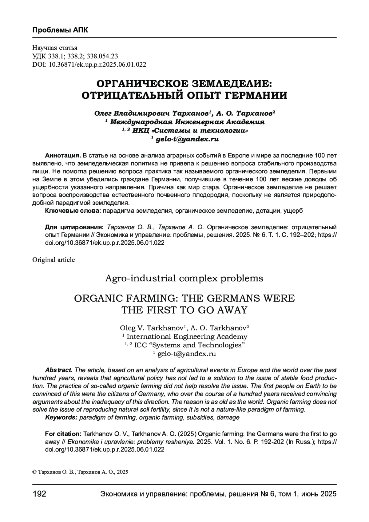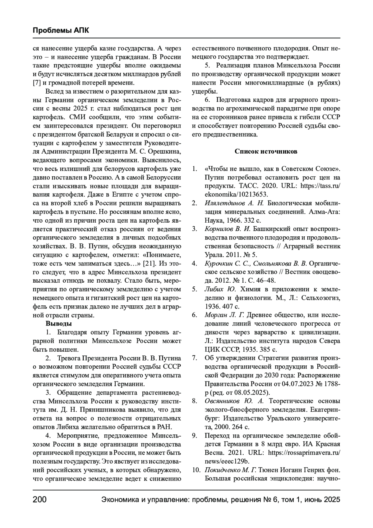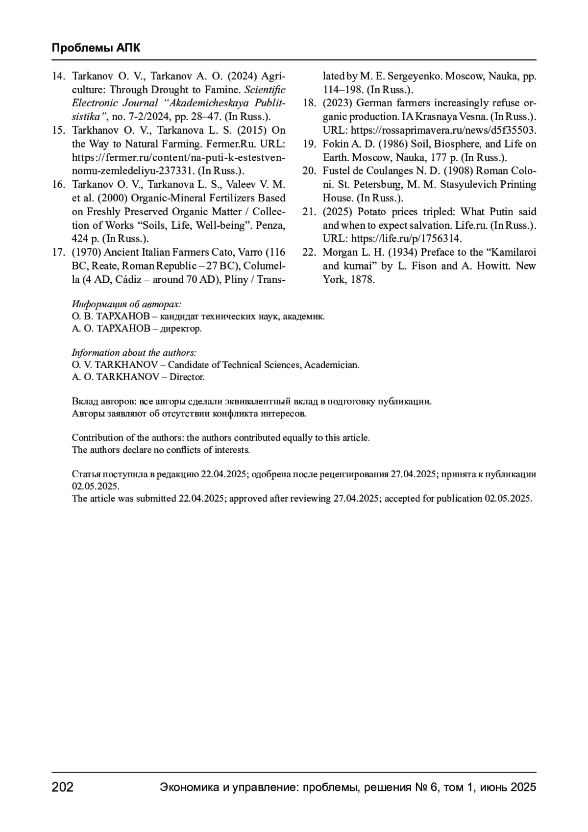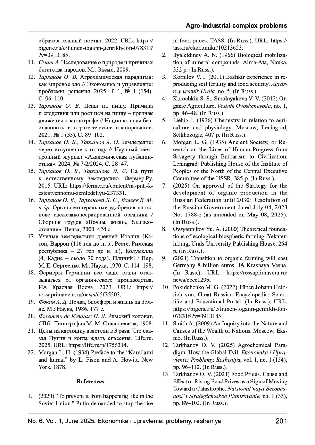 12. Тарханов О. В. Агрохимическая парадигма: как мировое зло // Экономика и управление: проблемы, решения. 2025. Т. 1, № 1 (154). С. 96-110. EDN: OYFLCG