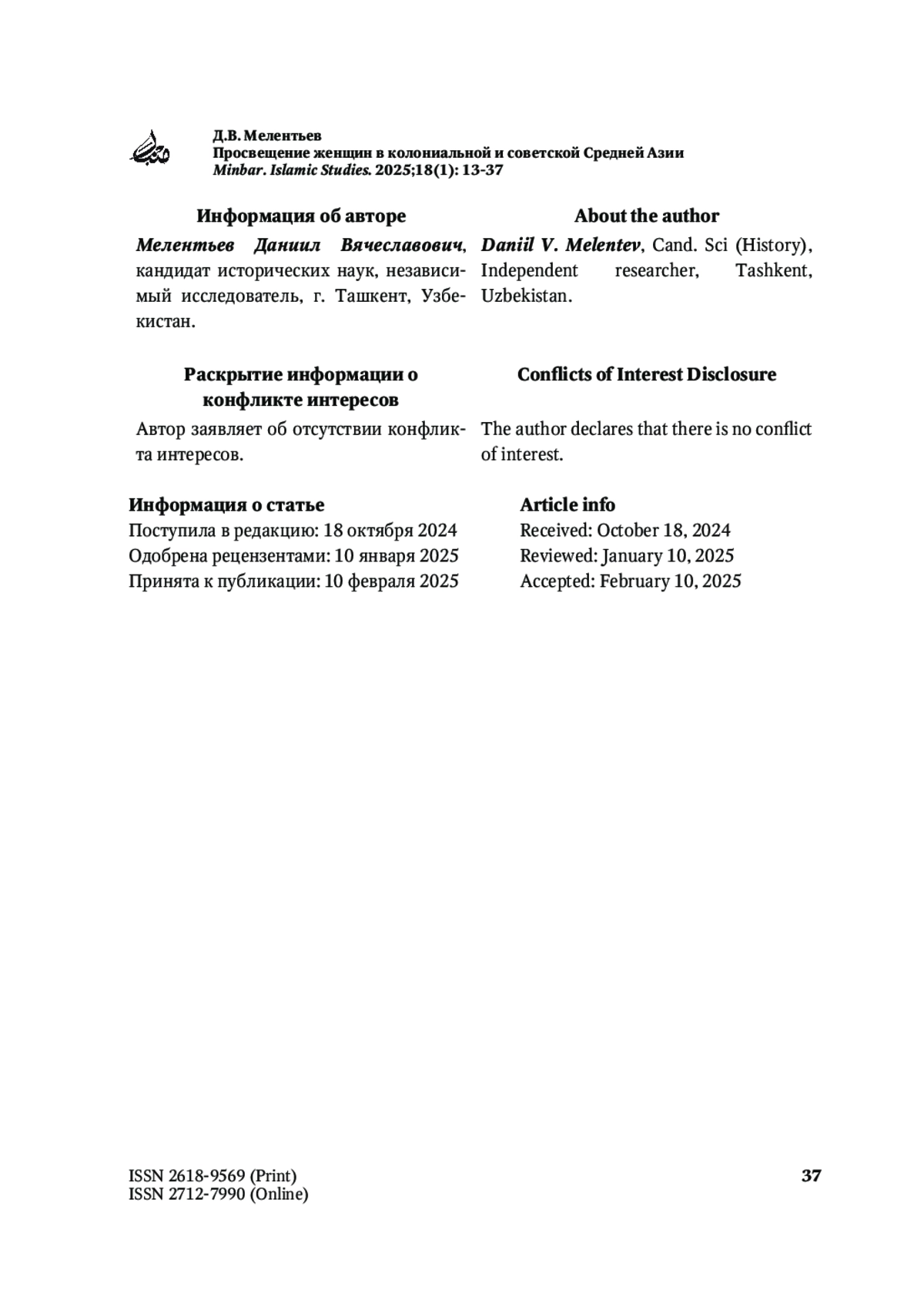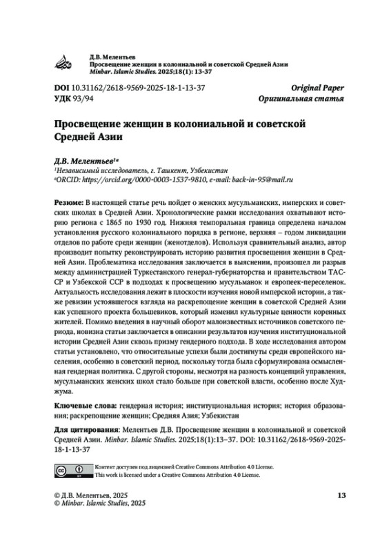 50. Мелентьев Д.В. Роль Главного Вакуфного Управления в советизации мусульманского образования и становлении советской сети школ в Туркестане. Islamology. 2018;1:57-77.