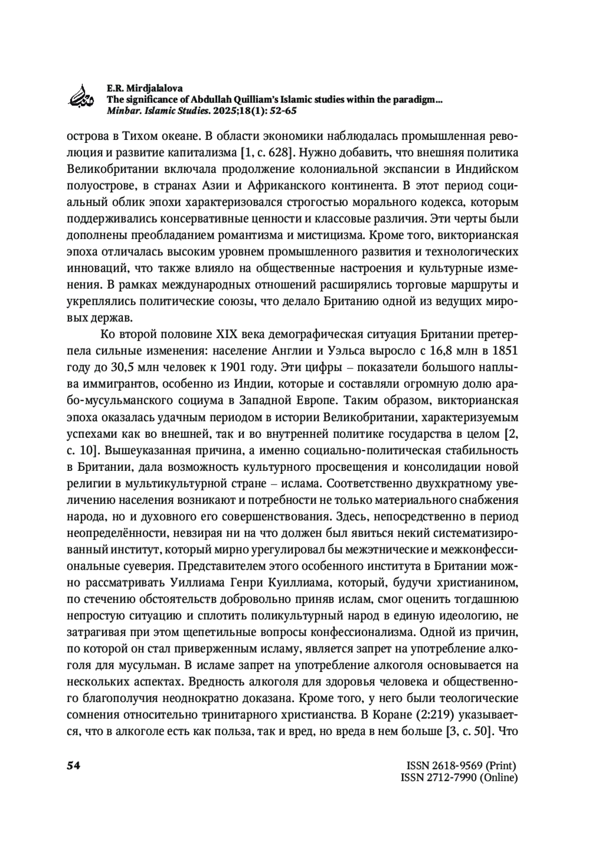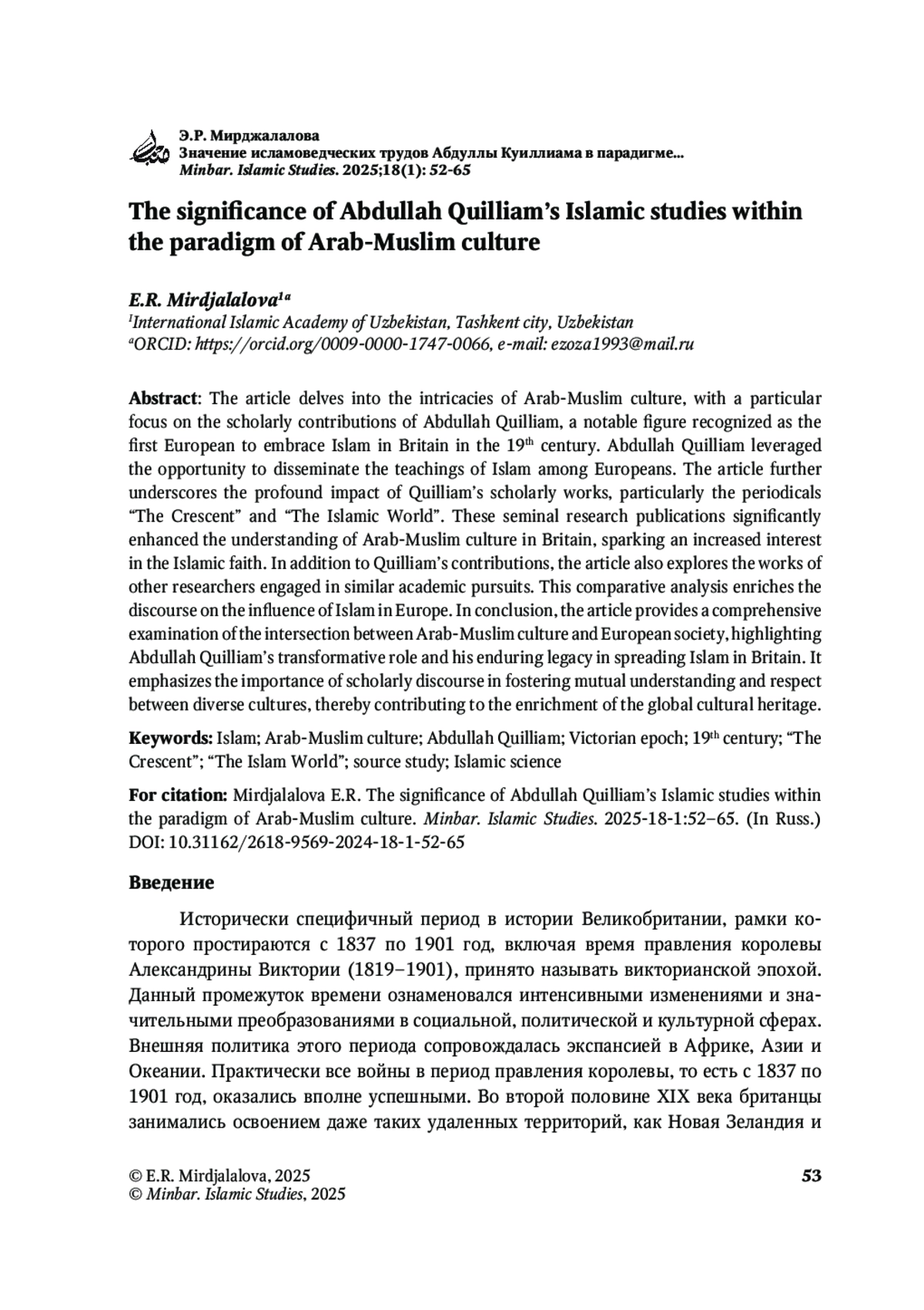 Статья посвящена рассмотрению наследия арабско-мусульманской культуры, а именно анализу научного вклада Абдуллы Куиллиама, выдающейся личности, которая имеет звание первого европейца, в XIX веке принявшего ислам в Британии. Абдулла Куиллиам использовал возможность для распространения учений ислама среди европейцев. В статье подчеркивается глубокое влияние научных работ Куиллиама, в частности периодических изданий «The Crescent» и «The Islamic World». Эти знаковые исследовательские работы значительно укрепили знания об арабо-мусульманской культуре в Британии, вызвав всплеск интереса к исламской вере. Помимо вклада Куиллиама, в статье также анализируются работы других исследователей, которые занимались аналогичными академическими поисками. Этот сравнительный анализ обогащает дискурс о влиянии ислама в Европе. Статья представляет собой всеобъемлющее рассмотрение пересечения арабо-мусульманской культуры и ценностей европейского общества, в ней уделяется особое внимание на трансформационную роль Абдуллы Куиллиама и его выдающийся вклад в распространение ислама в Британии, а также в установление взаимопонимания и уважения между представителями различных культур.