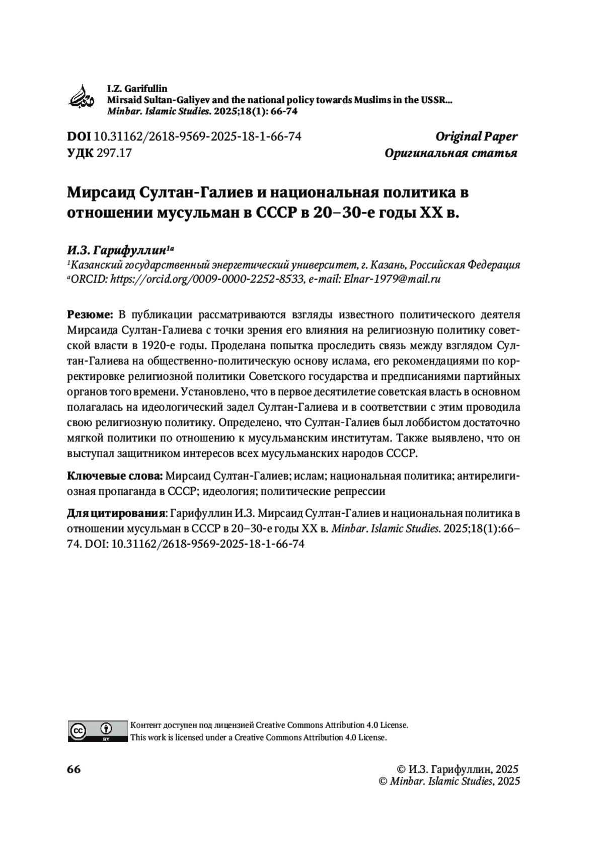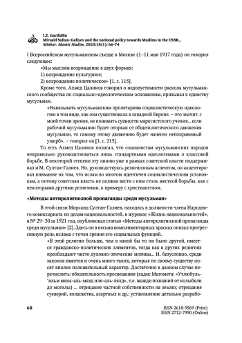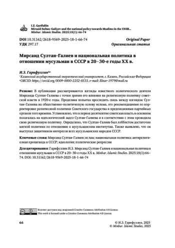 В публикации рассматриваются взгляды известного политического деятеля Мирсаида Султан-Галиева с точки зрения его влияния на религиозную политику советской власти в 1920-е годы. Проделана попытка проследить связь между взглядом Султан-Галиева на общественно-политическую основу ислама, его рекомендациями по корректировке религиозной политики Советского государства и предписаниями партийных органов того времени. Установлено, что в первое десятилетие советская власть в основном полагалась на идеологический задел Султан-Галиева и в соответствии с этим проводила свою религиозную политику. Определено, что Султан-Галиев был лоббистом достаточно мягкой политики по отношению к мусульманским институтам. Также выявлено, что он выступал защитником интересов всех мусульманских народов СССР.
