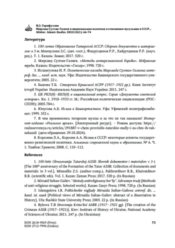 3. Исламгулова И. Р. Политические взгляды Мирсаида Султан-Галиева: автореф. дис. … канд. ист. наук. Уфа: Издательство Башкирского государственного университета; 2005. 22 с.