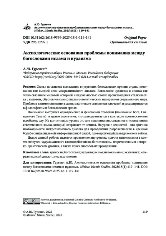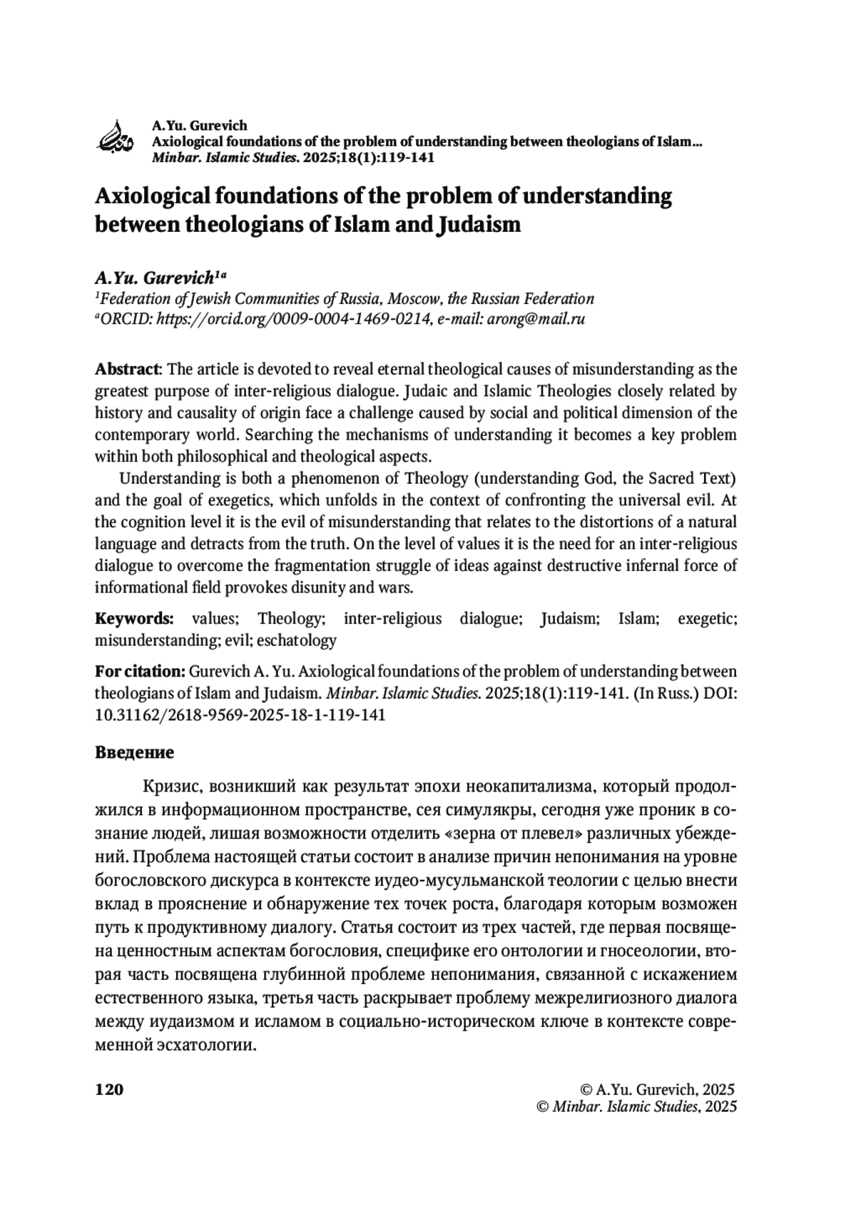 Целью данной работы является прояснение внутренних причин непонимания в контексте иудео-мусульманского взаимодействия на богословском, теоретическом и историко-практическом уровнях, а также поиск способов их преодоления.