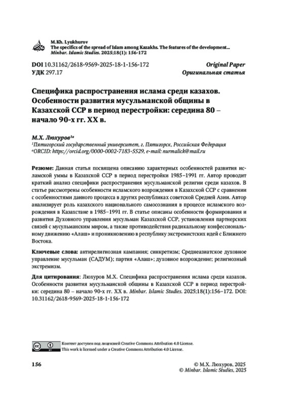 Данная статья посвящена описанию характерных особенностей развития исламской уммы в Казахской ССР в период перестройки 1985–1991 гг. Автор проводит краткий анализ специфики распространения мусульманской религии среди казахов. В статье рассмотрены особенности исламского возрождения в Казахской ССР с сравнении с особенностями данного процесса в других республиках советской Средней Азии. Автор анализирует роль казахского национального самосознания в процессе исламского возрождения в Казахстане в 1985–1991 гг. В статье описаны особенности формирования и развития Духовного управления мусульман Казахской ССР, установления партнерских связей с мусульманским миром, а также противодействия радикальному конфессиональному движению «Алаш» и проникновению в республику экстремистских идей с Ближнего Востока.