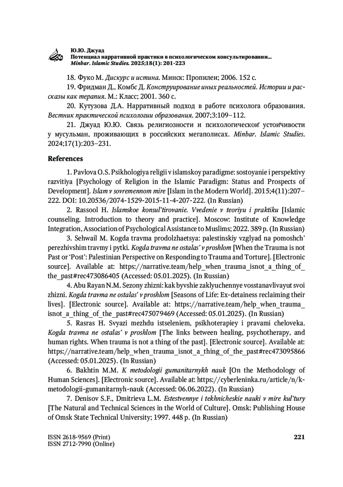 21. Джуад Ю.Ю. Связь религиозности и психологической устойчивости у мусульман, проживающих в российских мегаполисах. Minbar. Islamic Studies. 2024;17(1):203-231.