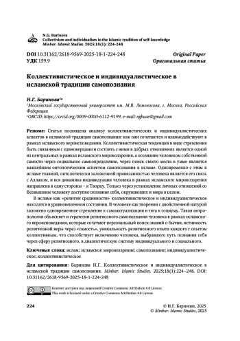 Статья посвящена анализу коллективистических и индивидуалистических аспектов в исламской традиции самопознания: как они сочетаются и взаимодействуют в рамках исламского вероисповедания. Коллективистическая тенденция в виде стремления быть связанным с единоверцами и состоять с ними в добрых отношениях является одной из центральных в рамках исламского мировоззрения, а осознание человеком собственной самости через социальное самоопределение, через поиск своего места в умме является важнейшим онтологическим аспектом самопознания в исламе. Одновременно с этим в исламе главной, онтологически заложенной привязанностью человека является его связь с Аллахом, и вся динамика индивидуации человека в рамках исламского мировоззрения направлена в одну стороны – к Творцу. Только через установление личных отношений со Всевышним человеку доступно познание себя, окружающих и мира в целом.