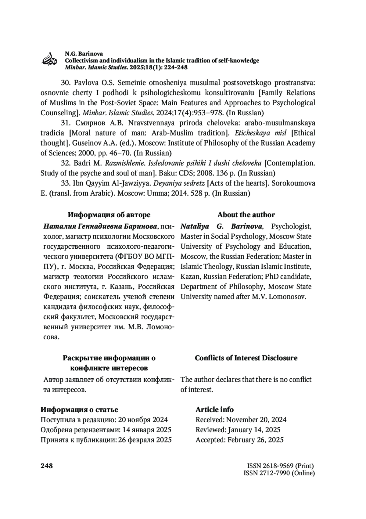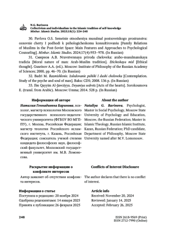 30. Павлова О.С. Семейные отношения мусульман постсоветского пространства: основные черты и подходы к психологическому консультированию. Minbar. Islamic Studies. 2024;17(4):953-978.
