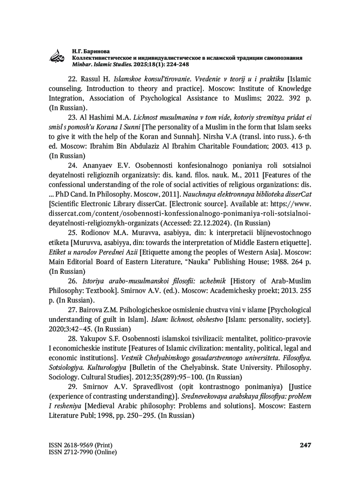 22. Рассул Х. Исламское консультирование. Введение в теорию и практику. М.: Институт интеграции знаний, Ассоциация психологической помощи мусульманам; 2022. 392 с.