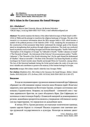 В статье рассматривается история старейшей мечети, основанной при шахе Исмаиле I (1501–1524) в Тбилиси, и попытка преобразования религиозного ландшафта в Грузии в начале XVI в.