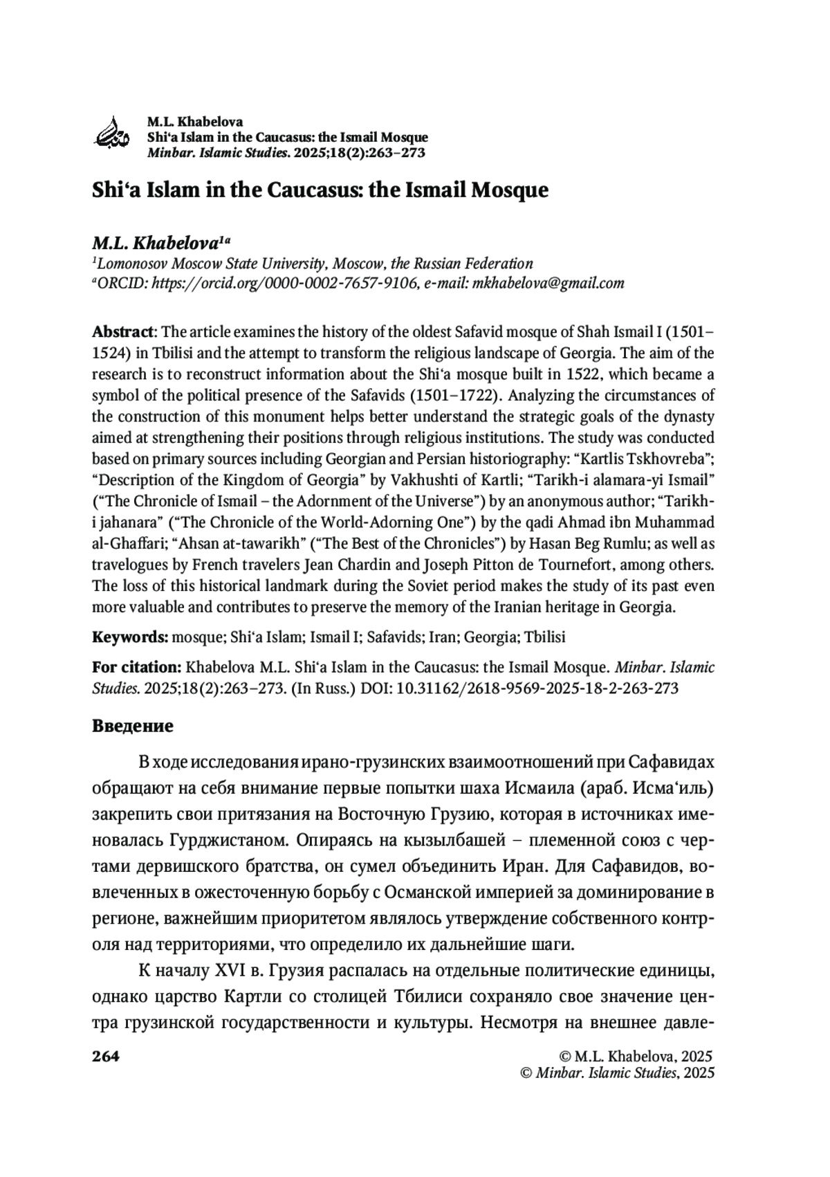 Цель исследования заключается в реконструкции сведений о шиитской мечети, возведенной в 1522 г. и ставшей символом политического присутствия Сафавидов (1501–1722).