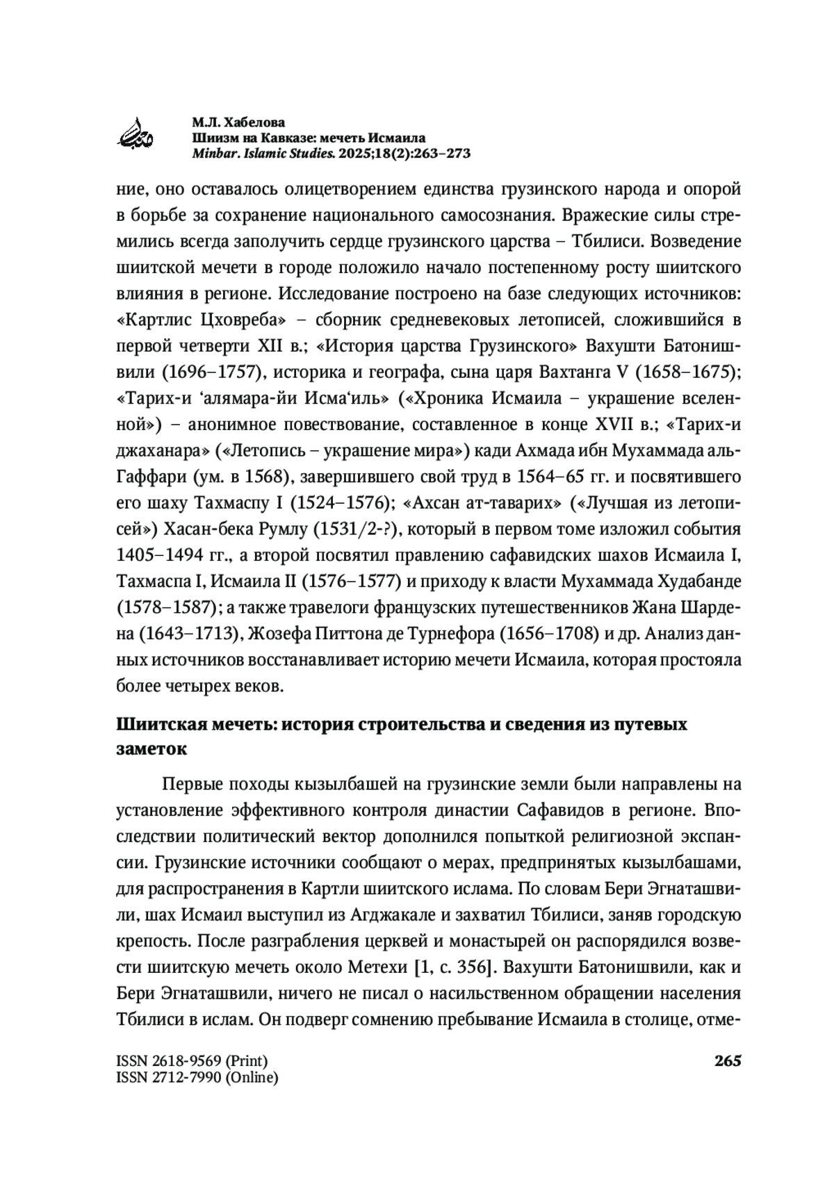 Анализ этого памятника позволяет лучше понять стратегические цели династии, направленные на укрепление позиций через религиозные институты. Исследование проведено на источниковой базе, включающей в себя грузинскую и персидскую хронистику: «Картлис Цховреба»; «История царства Грузинского» Вахушти Батонишвили; «Тарих-и ‘алямарайи Исма‘иль» («Хроника Исмаила – украшение вселенной») анонимного автора; «Тарих-и джаханара» («Летопись – украшение мира») кади Ахмада ибн Мухаммада аль-Гаффари; «Ахсан ат-таварих» («Лучшая из летописей») Хасан-бека Румлу, а также травелоги французских путешественников Жана Шардена, Жозефа Питтона де Турнефора и др. Утрата в советский период памятника – мечети Исмаила – подчеркивает значимость его изучения, делая исследование его прошлого особенно важным и способствуя сохранению памяти о культурном наследии эпохи Сафавидов.
