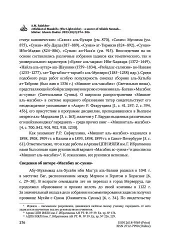 Статья посвящена описанию свода хадисов одного из известных в истории ислама ученых-энциклопедистов аль-Хусайна аль-Багави «Масабих ас-сунна», легшего в основу получившего распространение во всем мусульманском мире и использовавшегося в системе народного образования татар в XIX в., в частности сборника хадисов «Мишкят аль-масабих». В работе приводится оглавление «Масабих ас-сунна» и подробное содержание некоторых его книг для более развернутого представления о сборнике; описаны дополнения автора «Мишкят аль-масабих» ат-Табризи к труду аль-Багави; даны некоторые биографические сведения об аль-Багави, а также представлен фрагмент из его сочинения «Шарх ас-сунна» в качестве иллюстрации учености автора. «Мишкят аль-масабих» служил источником достоверной Сунны в татарских конфессиональных школах и знакомил учащихся со значительным объемом хадисов.