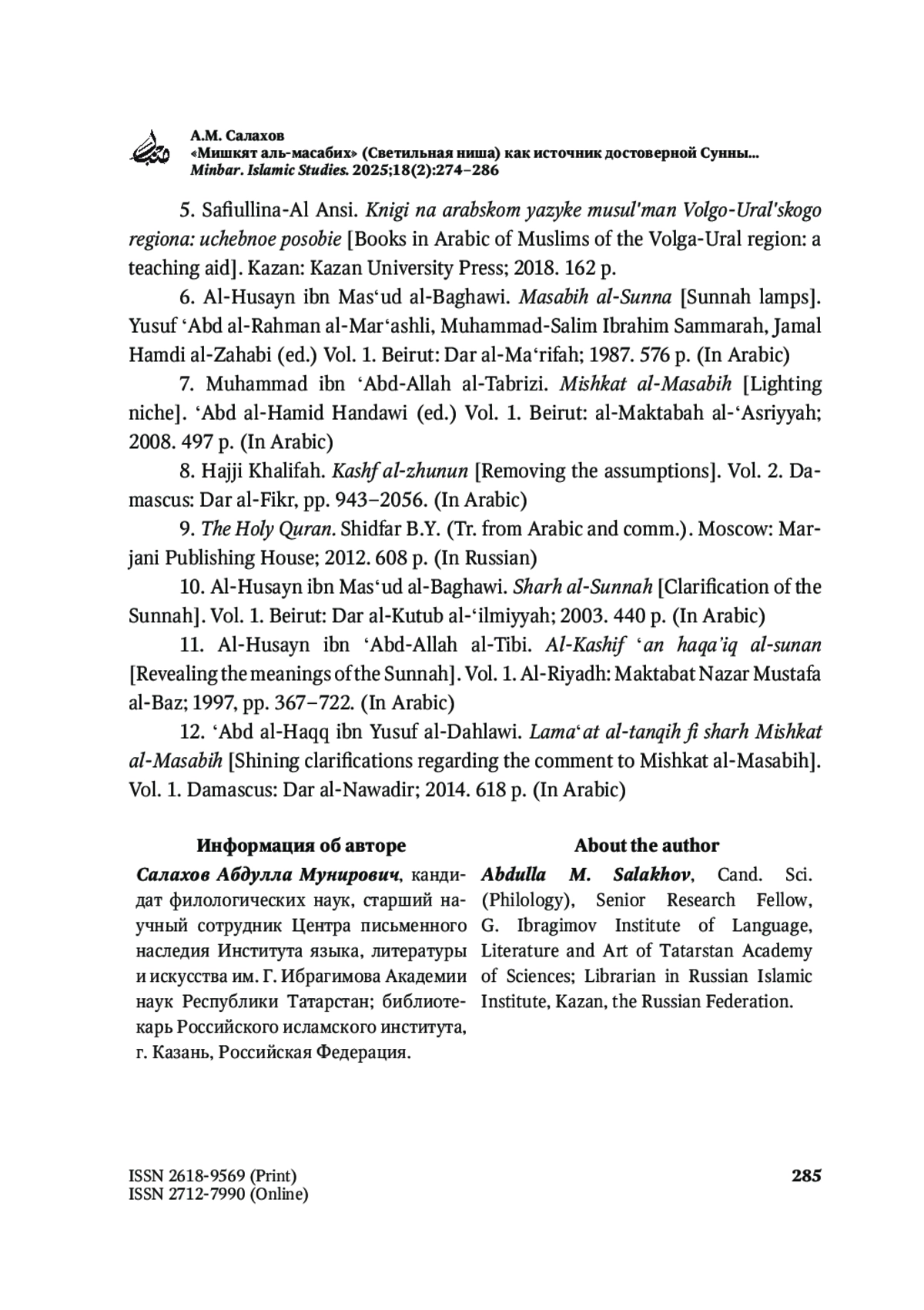 10. Аль-Хусайн ибн Масʻуд аль-Багави. Шарх ас-сунна. Т. 1. Бейрут: Дар аль-Кутуб аль-ʻильмиййа; 2003. 440 с.