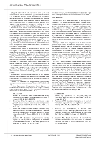 1. Бахин С.В., Еременко И.Ю. Односторонние экономические “санкции” и международное право // Закон“, 2017, № 11. С. 162-175. EDN: ZVRJVB