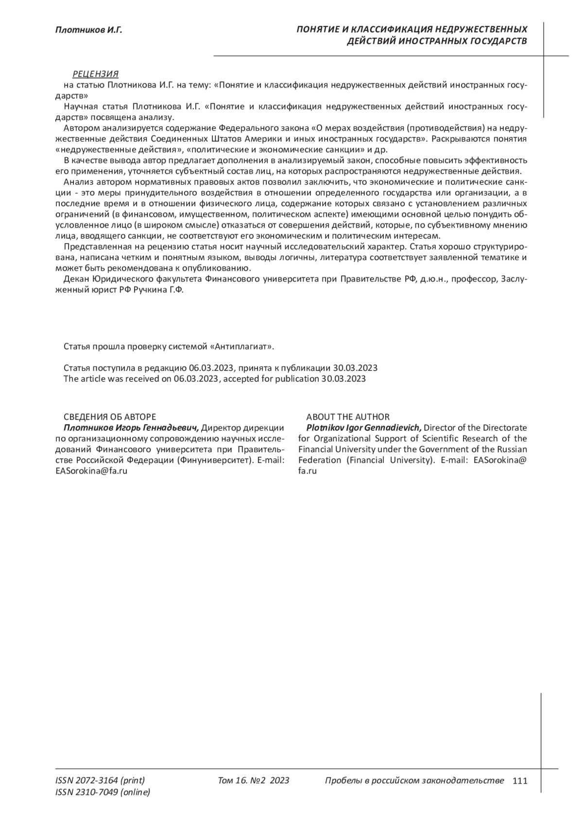 Цель - анализ содержания Федерального закона «О мерах воздействия (противодействия) на недружественные действия Соединенных Штатов Америки и иных иностранных государств», раскрываются понятия «недружественные действия», «политические и экономические санкции» и др., в качестве вывода предлагаются дополнения в анализируемый закон, способные повысить эффективность его применения, уточняется субъектный состав лиц, на которых распространяются недружественные действия.