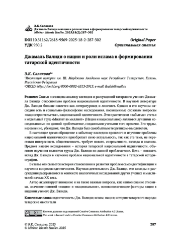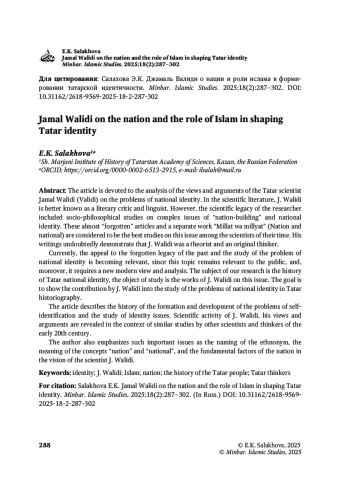 Статья посвящена анализу взглядов и рассуждений татарского ученого Джамаля Валиди относительно проблем национальной идентичности. В научной литературе Дж. Валиди больше известен как литературовед и лингвист. Однако в его научном наследии есть и социально-философские исследования, посвященные сложным вопросам «нациостроительства», национальной идентичности. Эти практически «забытые» статьи и отдельный труд «Милләт вә миллият» (Нация и национальное) являются лучшими исследованиями по данной проблематике, созданными учеными того времени. Его труды, несомненно, убеждают, что Дж. Валиди был самобытным теоретиком-мыслителем. В настоящее время обращение к забытому наследию прошлого и изучение проблемы национальной идентичности приобретают свою актуальность, так как эта тема, не переставая интересовать общественность, требует нового, современного, взгляда и анализа.