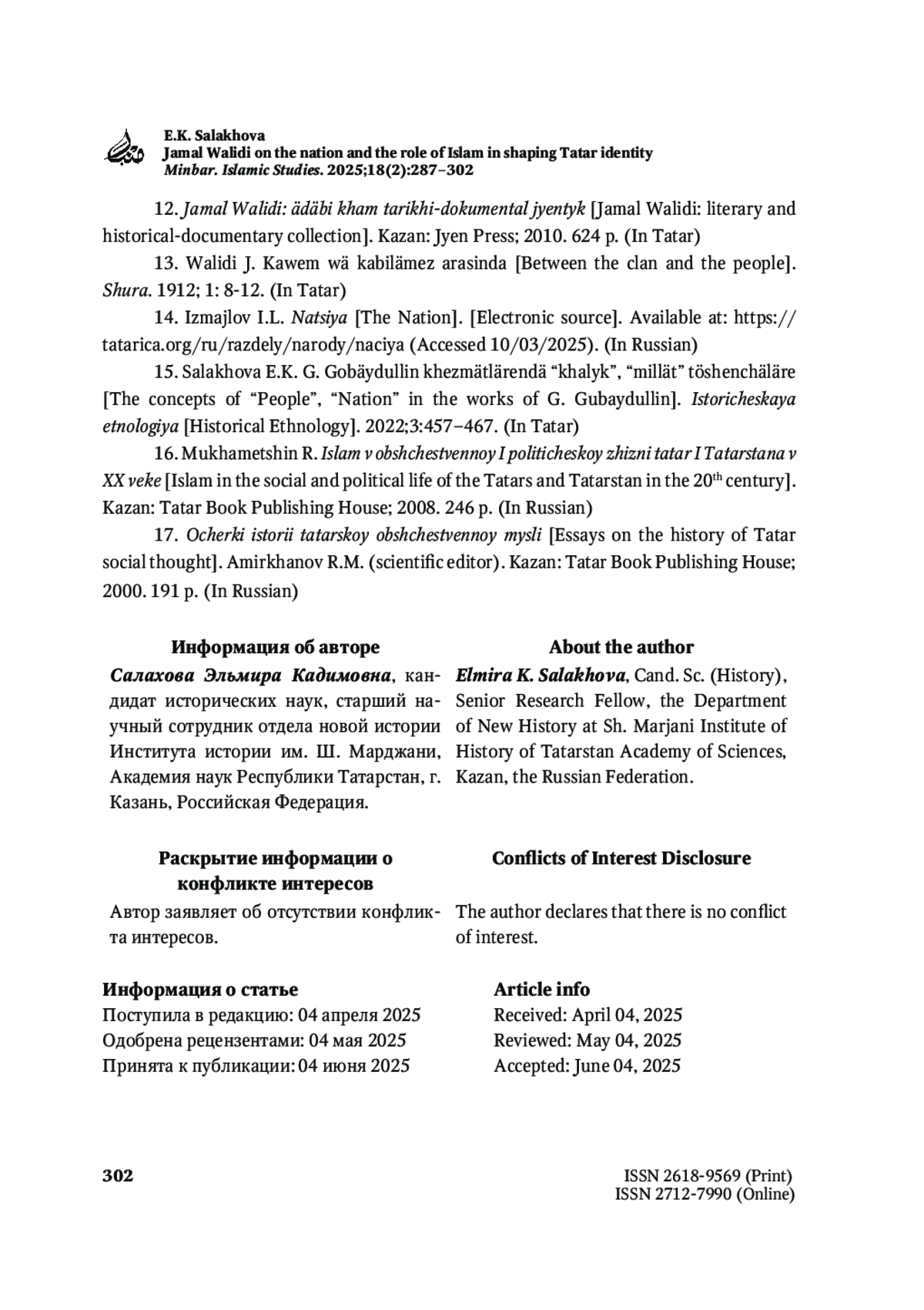 15. Сәлахова Э.К. Газиз Гобәйдуллин хезмәтләрендә «халык», «милләт» төшенчәләре. Историческая этнология: 2022;3:457-467.
