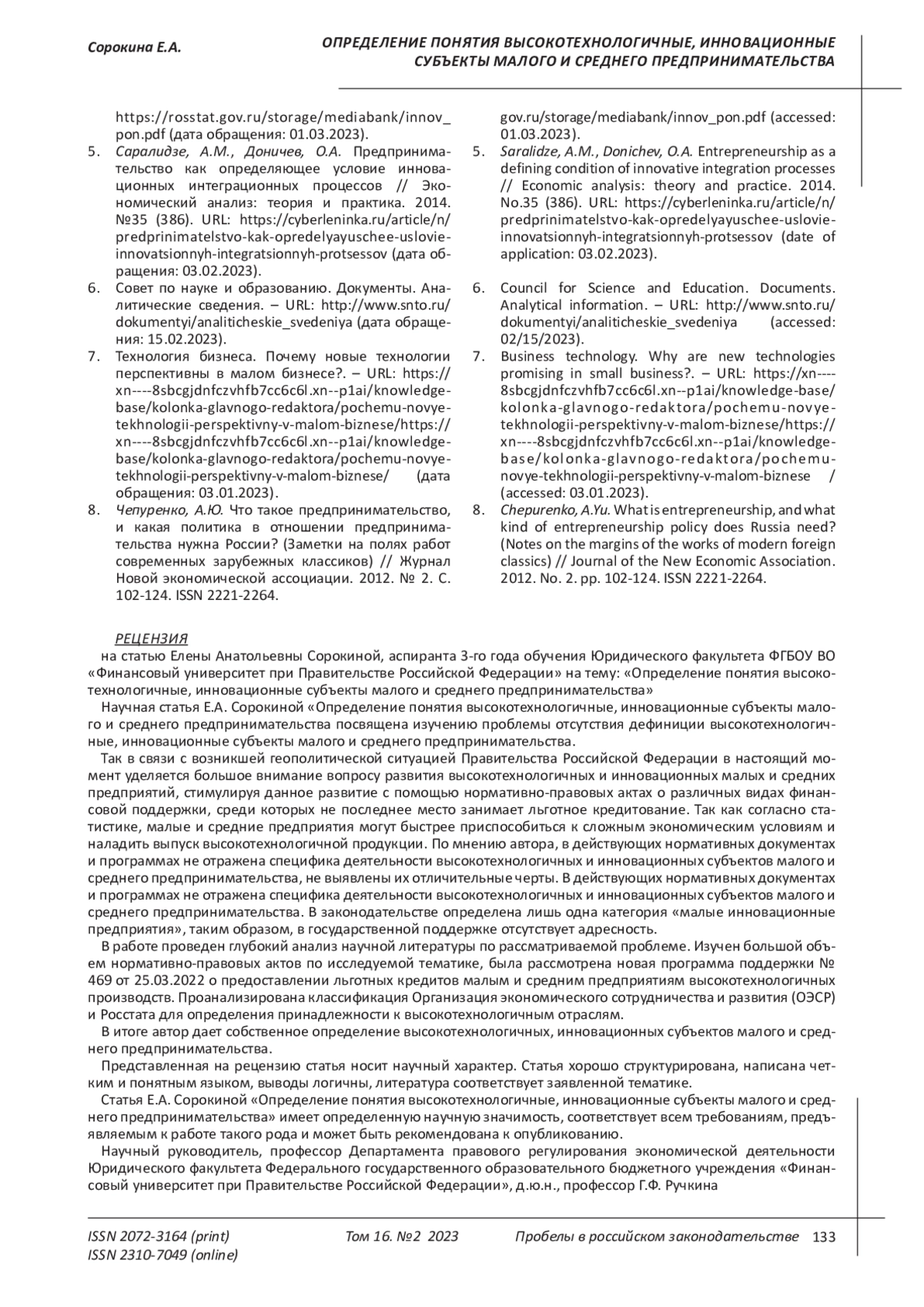 8. Чепуренко, А.Ю. Что такое предпринимательство, и какая политика в отношении предпринимательства нужна России? (Заметки на полях работ современных зарубежных классиков) // Журнал Новой экономической ассоциации. 2012. № 2. С. 102-124. ISSN 2221-2264. EDN: OZNIKJ