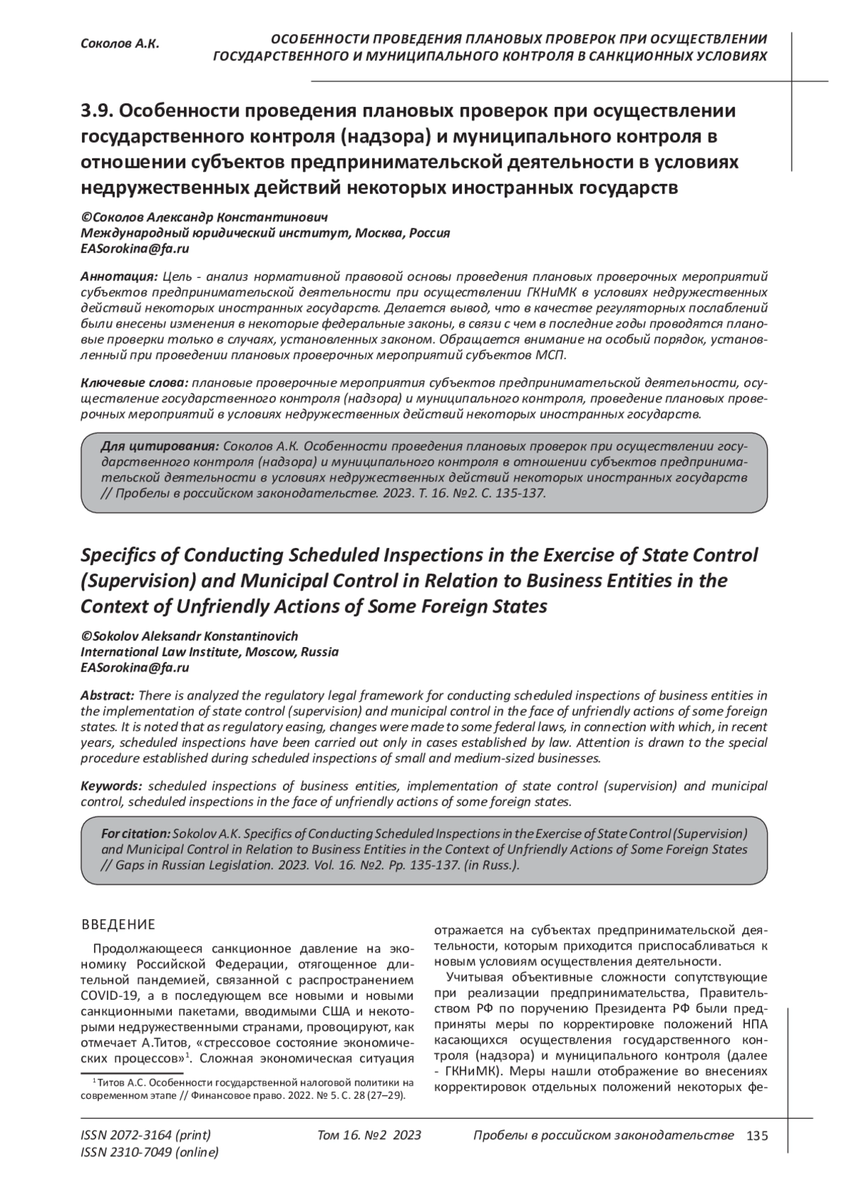 Цель - анализ нормативной правовой основы проведения плановых проверочных мероприятий субъектов предпринимательской деятельности при осуществлении ГКНиМК в условиях недружественных действий некоторых иностранных государств. Делается вывод, что в качестве регуляторных послаблений были внесены изменения в некоторые федеральные законы, в связи с чем в последние годы проводятся плановые проверки только в случаях, установленных законом. Обращается внимание на особый порядок, установленный при проведении плановых проверочных мероприятий субъектов МСП.