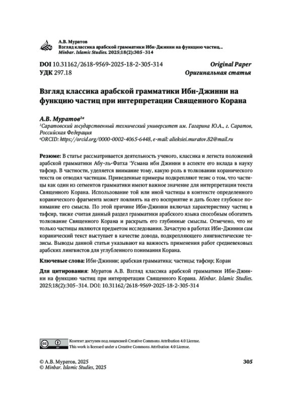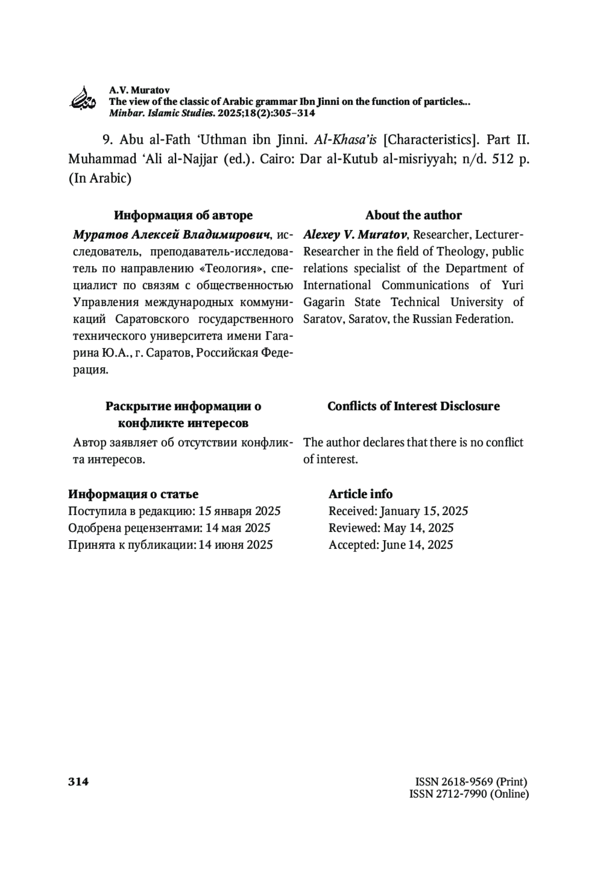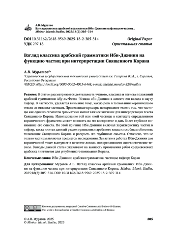 1. Муратов А.В. Толкование Коранических слов через призму теории «Аль-Иштикак аль-акбар» Ибн Джинни. Minbar. Islamic Studies. 2023;16(4):805-815. https://doi.org/10.31162/2618-9569-2023-16-4-805-815