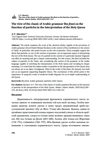 В статье рассматривается деятельность ученого, классика и легиста положений арабской грамматики Абу-ль-Фатха ‘Усмана ибн Джинни в аспекте его вклада в науку тафсир. В частности, уделяется внимание тому, какую роль в толковании коранического текста он отводил частицам. Приведенные примеры подкрепляют тезис о том, что частицы как один из сегментов грамматики имеют важное значение для интерпретации текста Священного Корана. Использование той или иной частицы в контексте определенного коранического фрагмента может повлиять на его восприятие и дать более глубокое понимание его смысла. По этой причине Ибн-Джинни включал характеристику частиц в тафсир, также считая данный раздел грамматики арабского языка способным обогатить толкование Священного Корана и раскрыть его глубинные смыслы. Отмечено, что не только частицы являются предметом исследования. Зачастую в работах Ибн-Джинни сам коранический текст выступает в качестве довода, подкрепляющего лингвистические тезисы. Выводы данной статьи указывают на важность применения работ средневековых арабских лингвистов для углубленного понимания Корана.