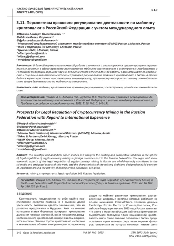 В данной научно-аналитической работе изучаются и анализируются существующие и перспективные решения в сфере правового регулирования майнинга криптовалют в иностранных государствах и Российской Федерации. В рамках научно-аналитического аспекта данной работы рассматриваются юридические и социально-экономические аспекты правового регулирования майнинга криптовалют в России, а также даётся характеристика существующему законопроекту, призванному выстроить систему законодательства вокруг деятельности по майнингу криптовалют.