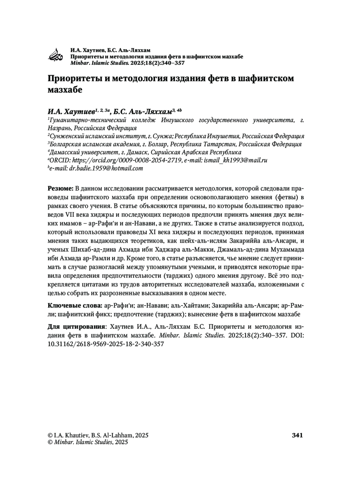 В данном исследовании рассматривается методология, которой следовали правоведы шафиитского мазхаба при определении основополагающего мнения (фетвы) в рамках своего учения. В статье объясняются причины, по которым большинство правоведов VII века хиджры и последующих периодов предпочли принять мнения двух великих имамов – ар-Рафи‘и и ан-Навави, а не других. Также в статье анализируется подход, который использовали правоведы XI века хиджры и последующих периодов, принимая мнения таких выдающихся теоретиков, как шейх-аль-ислям Закариййа аль-Ансари, и ученых Шихаб-ад-дина Ахмада ибн Хаджара аль-Макки, Джамаль-ад-дина Мухаммада ибн Ахмада ар-Рамли и др. Кроме того, в статье разъясняется, чье мнение следует принимать в случае разногласий между упомянутыми учеными, и приводятся некоторые правила определения предпочтительности (тарджих) одного мнения другому. Всё это подкрепляется цитатами из трудов авторитетных исследователей мазхаба, изложенными с целью собрать их разрозненные высказывания в одном месте.