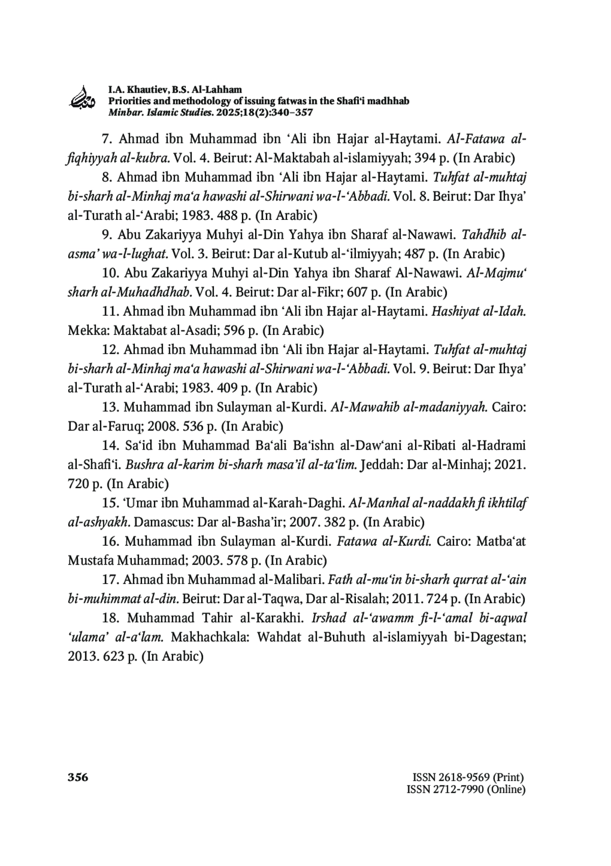 12. Ахмад ибн Мухаммад ибн ‘Али ибн Хаджар аль-Хайтами. Тухфат аль-мухтадж би-шарх аль-Минхадж ма‘а хаваши аш-Ширвани ва-ль-‘Аббади. Т. 9. Бейрут: Дар Ихйа’ ат-турас аль-‘араби; б. г. 409 с.