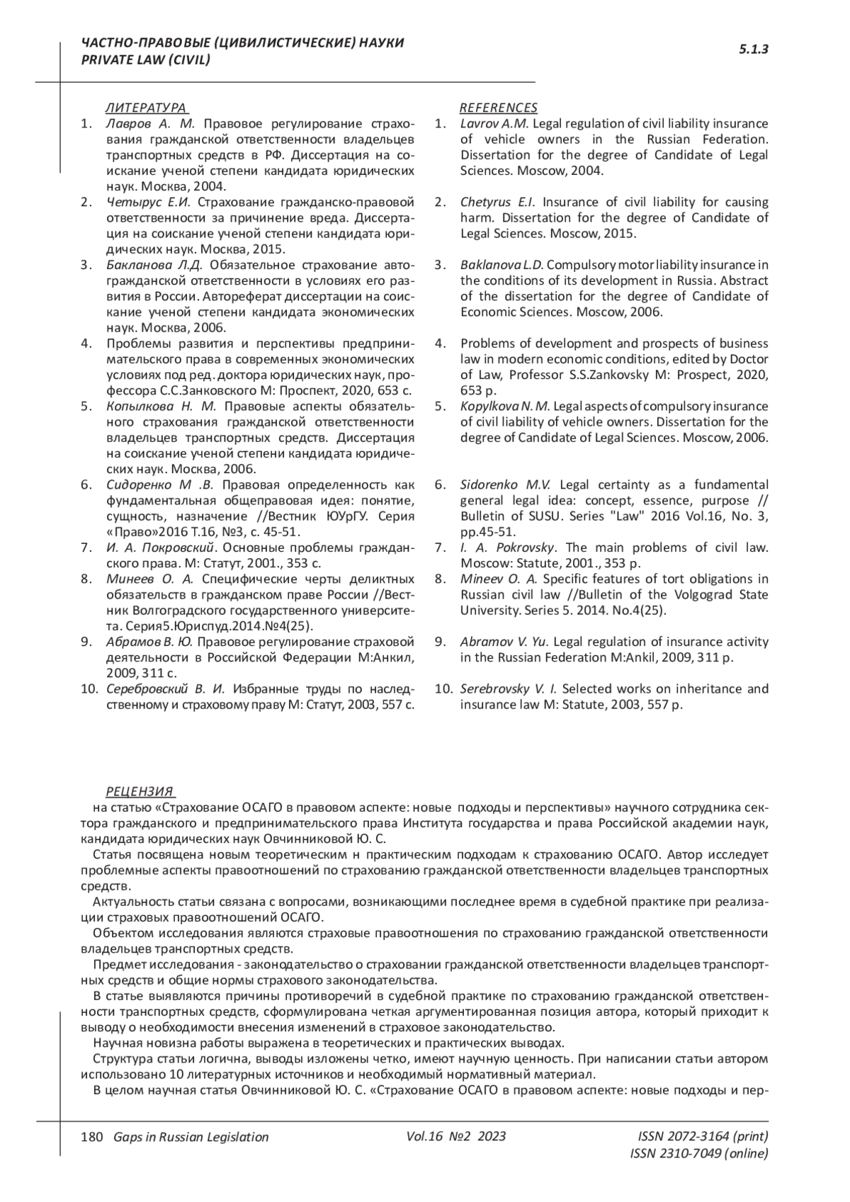 1. Лавров А. М. Правовое регулирование страхования гражданской ответственности владельцев транспортных средств в РФ. Диссертация на соискание ученой степени кандидата юридических наук. Москва, 2004. EDN: NJRZRD