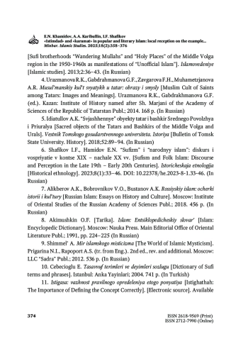 6. Шафиков И.Ф., Хамидов Е.Н. «Суфизм» и «народный ислам»: дискурс и восприятие в конце XIX - начале XX вв. Историческая этнология. 2023;8(1):33-46. https://doi.org/10.22378/he.2023-8-1.33-46
