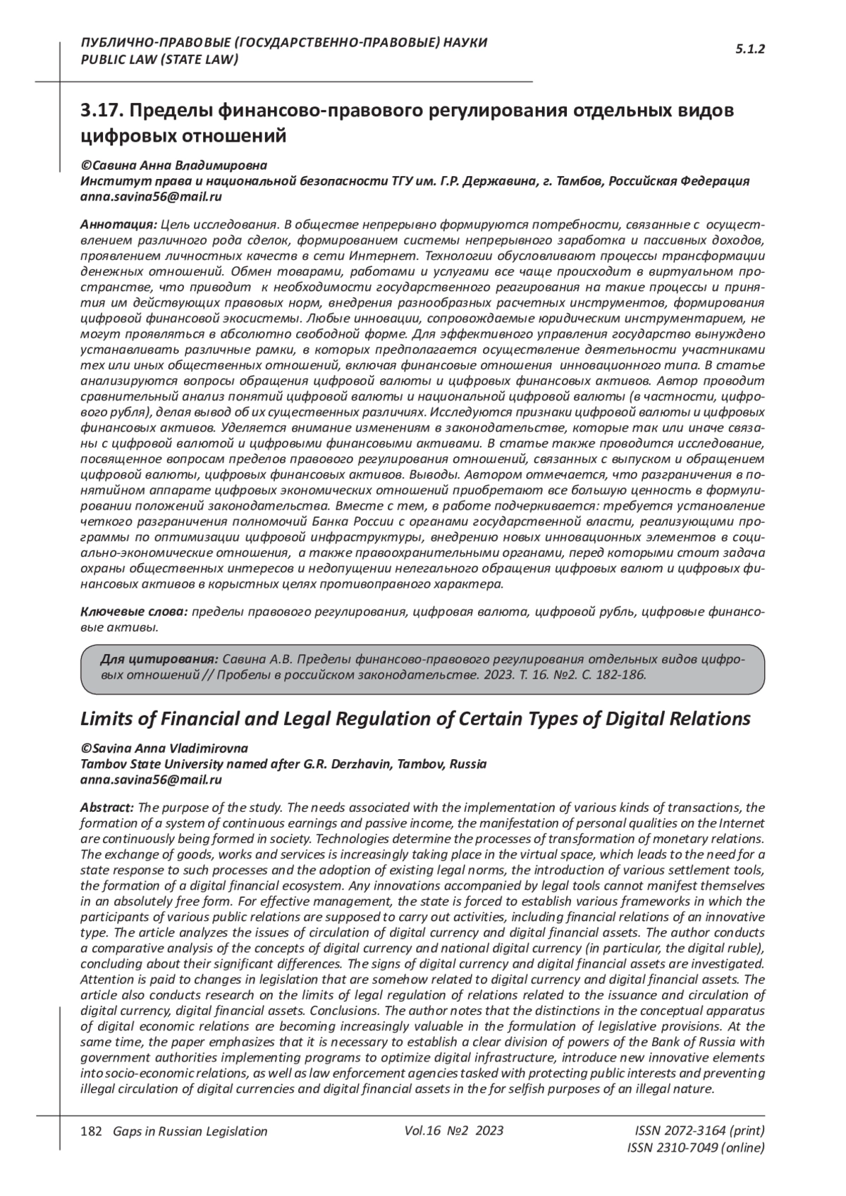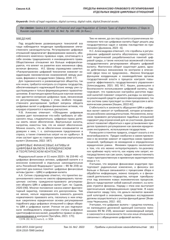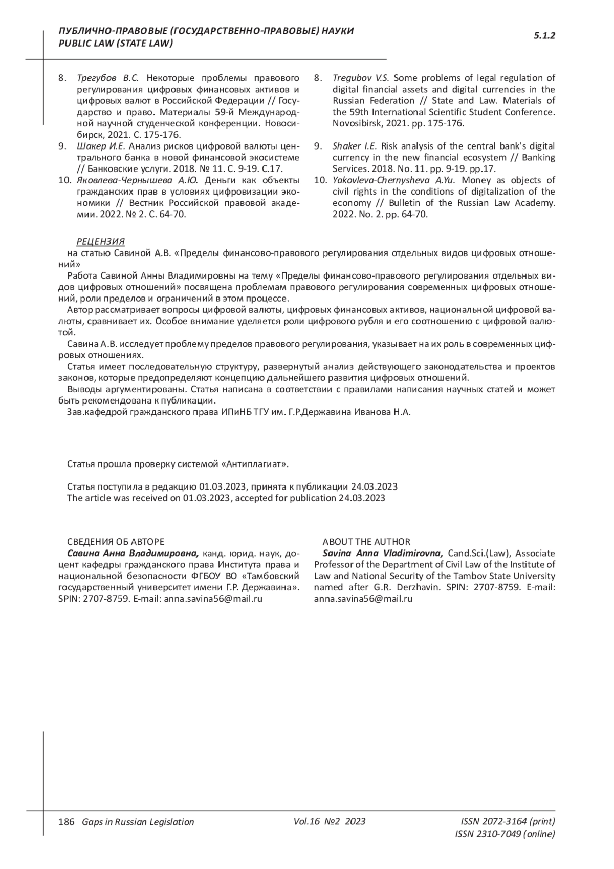 8. Трегубов В.С. Некоторые проблемы правового регулирования цифровых финансовых активов и цифровых валют в Российской Федерации // Государство и право. Материалы 59-й Международной научной студенческой конференции. Новосибирск, 2021. С. 175-176. EDN: AUVTNY